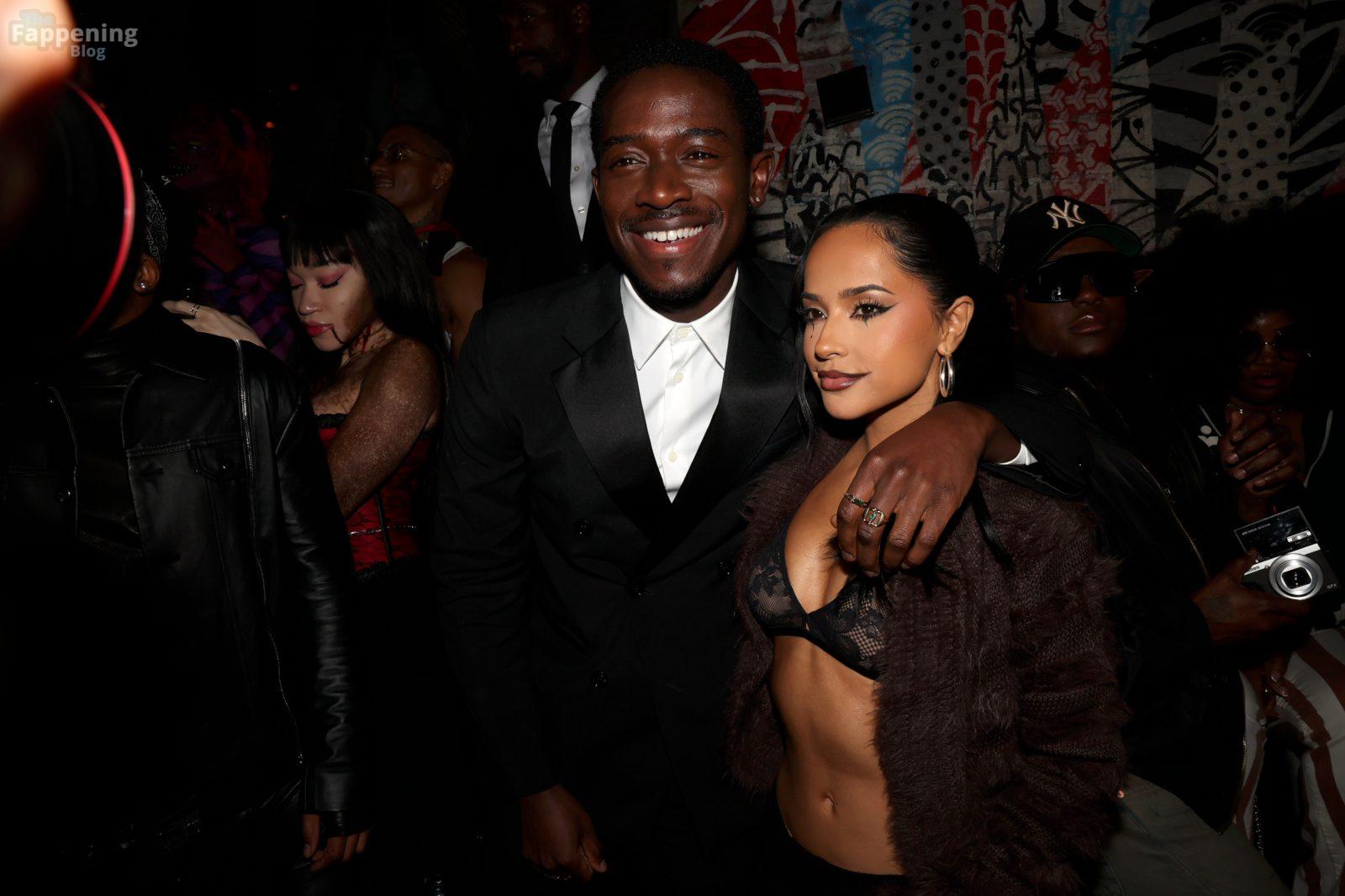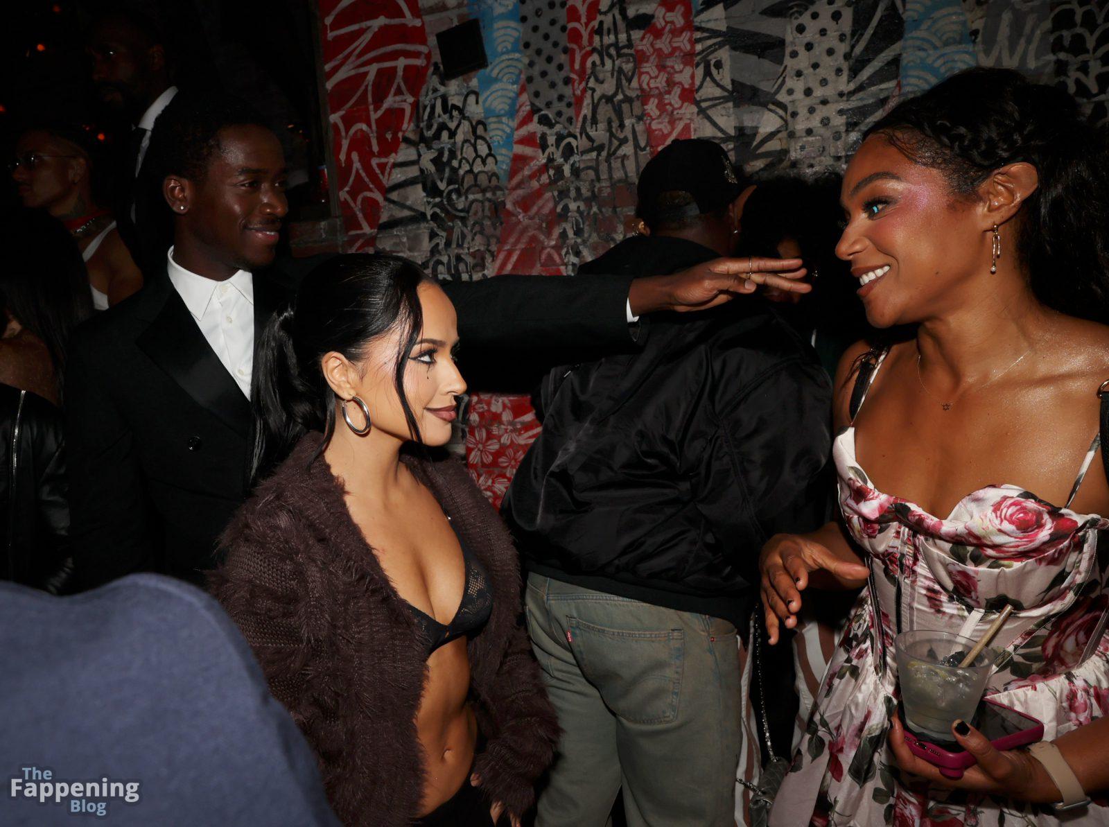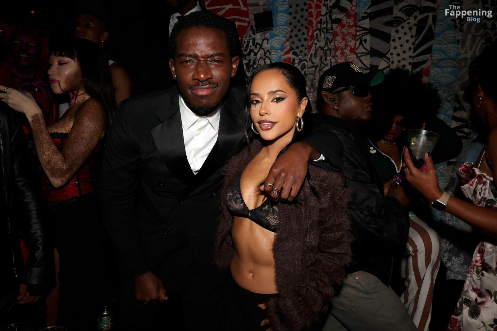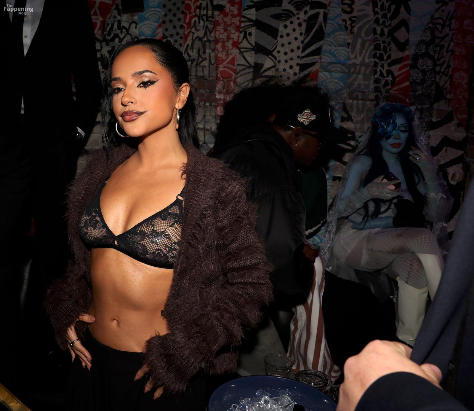 Becky G was pictured at NYC’s Costume Couture in a sheer bralette and fuzzy cardigan, showing off her tits and toned abs.