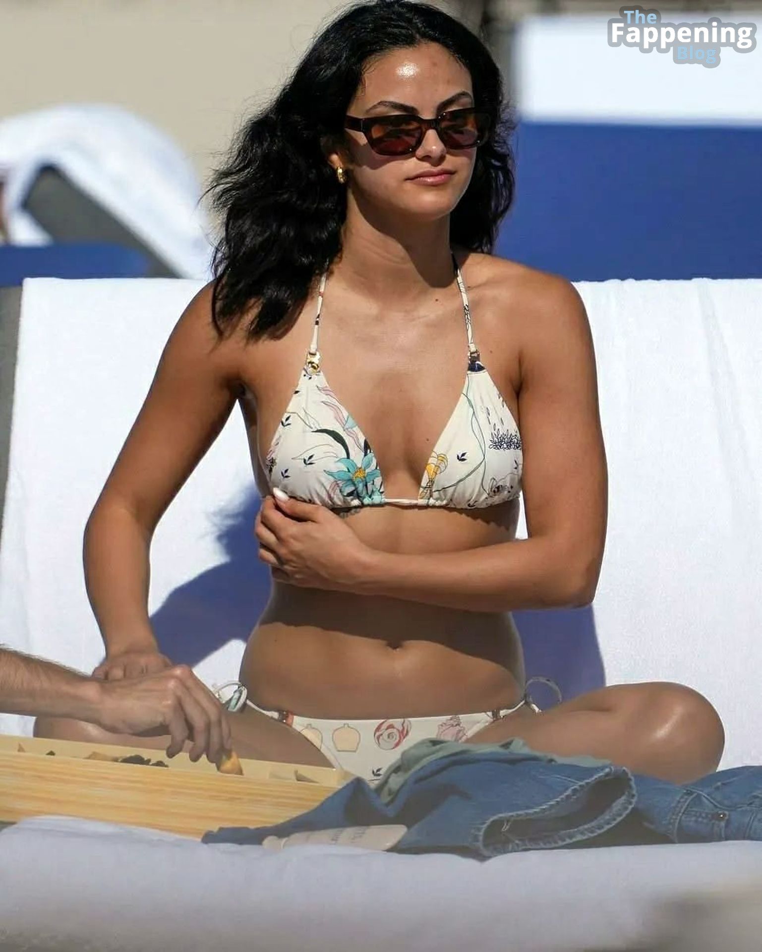 Camila Mendes shows off her bikini body on the beach in Miami. The 29-year-old American actress was joined by a male friend as she took in the bright sunshine wearing a two-piece skimpy swimsuit outside of the fashionable Hotel Setai.