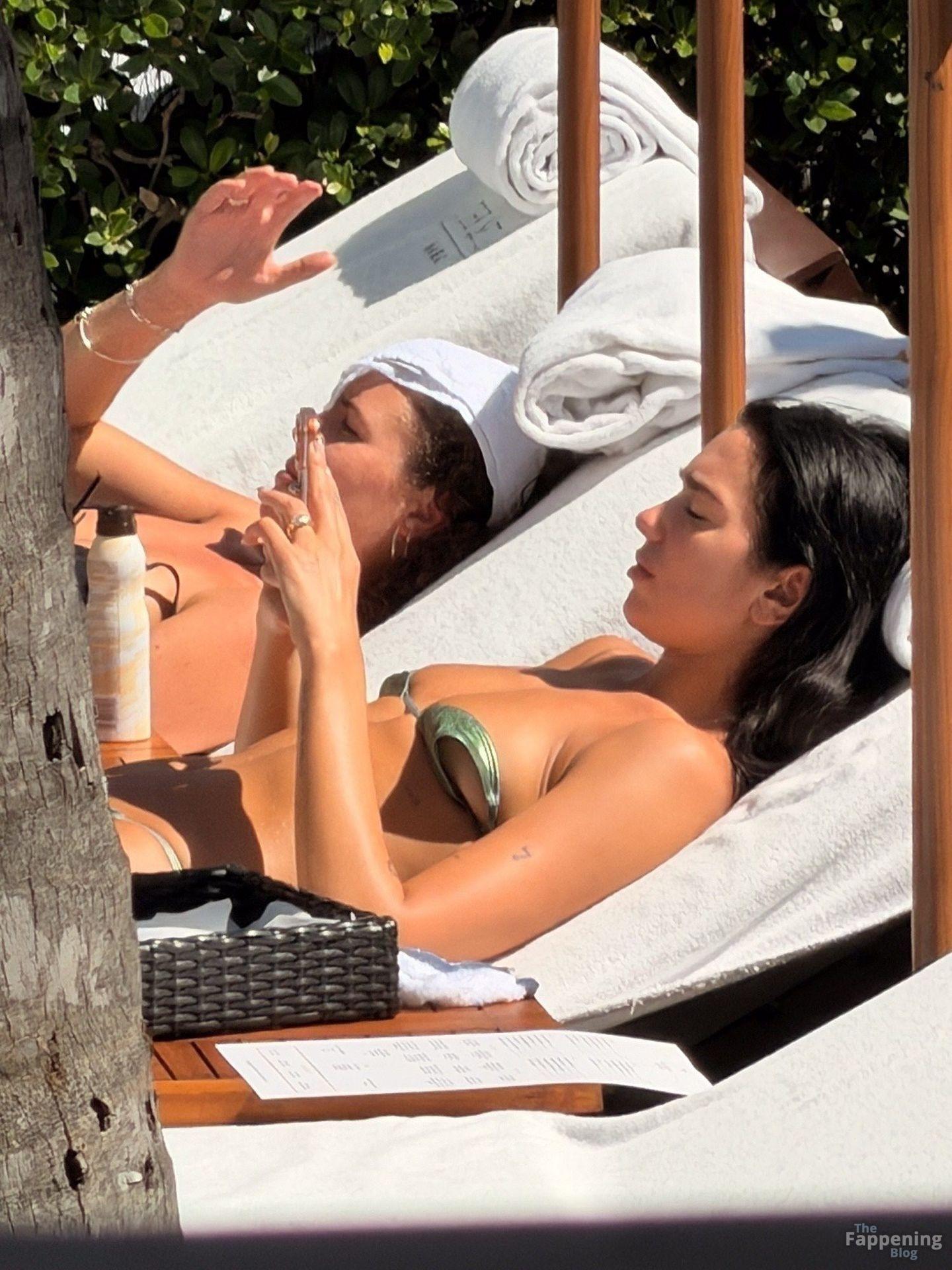 Dua Lipa cranked up the heat poolside in Miami, rockin’ a metallic green bikini that flashed titties and her tanned body.