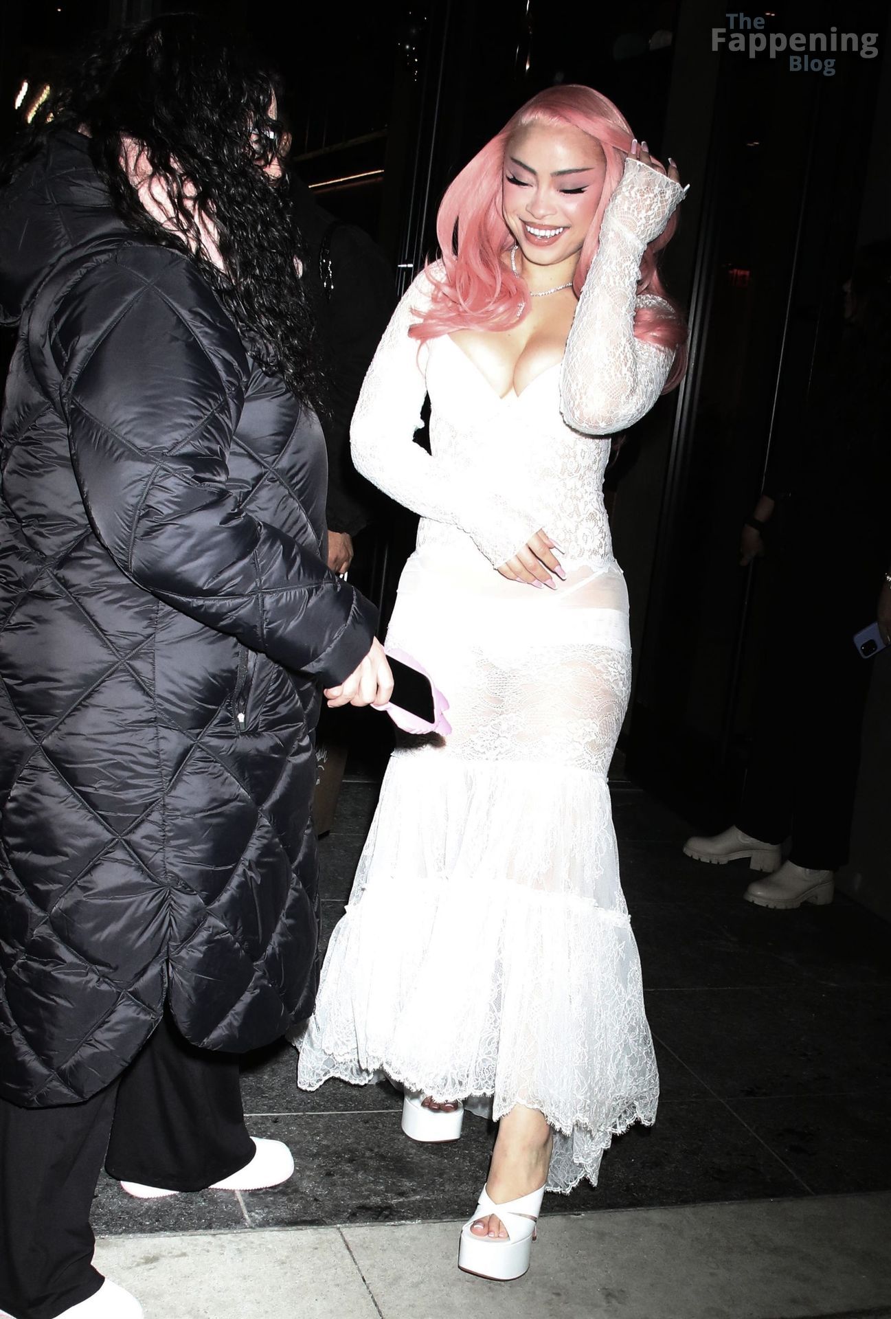 Check out Ice Spice rockin’ a sheer black dress and a lace bra, giving a peak at her nude big boobs with her pierced nipples on full display.