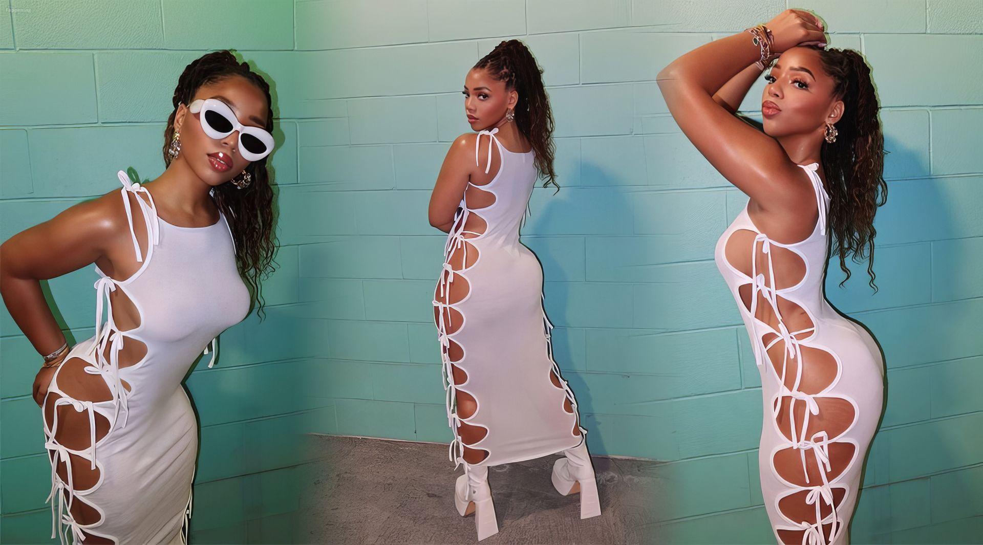 Chloe Bailey poses a braless, wearin’ a white dress with wild cut-outs. Look at her boobs and hips in the pics below.