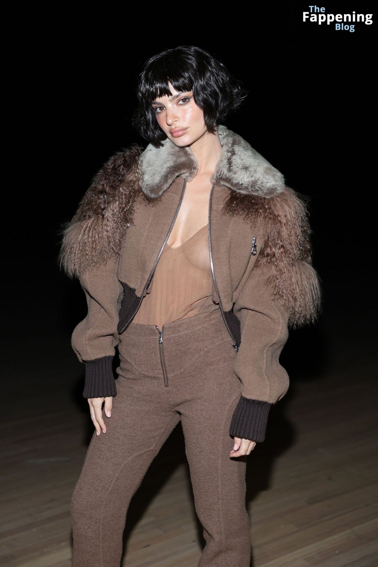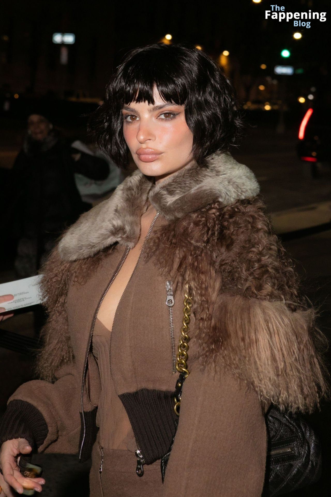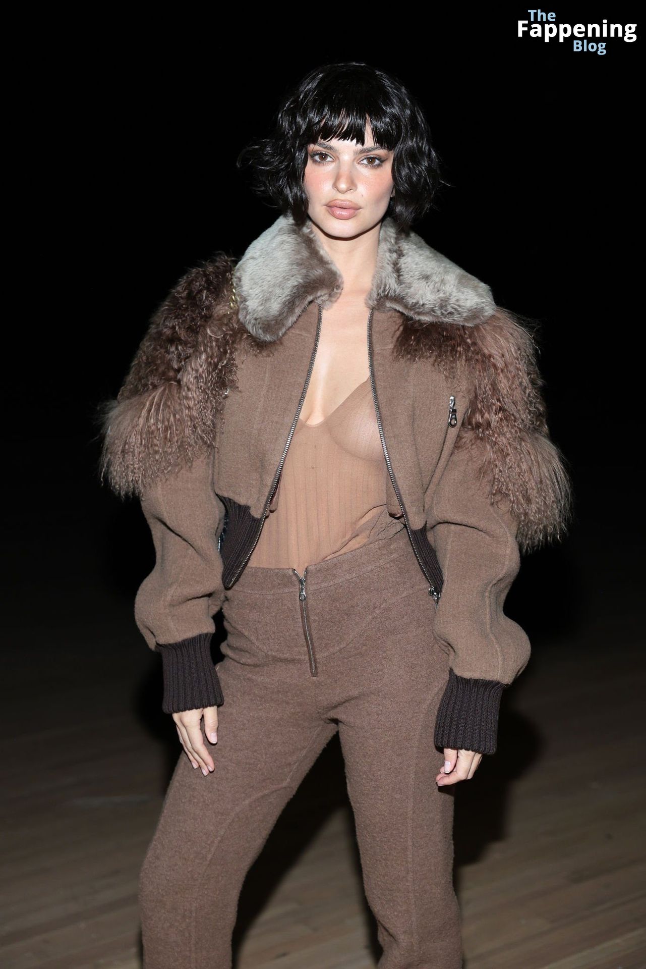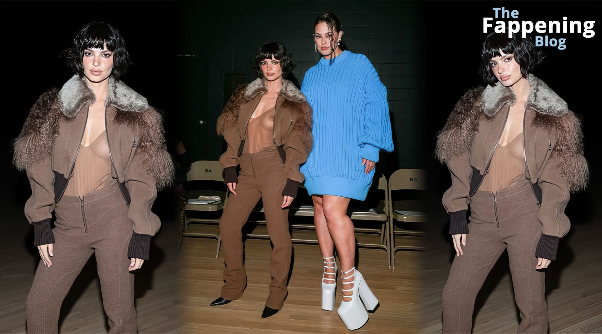 Emily Ratajkowski shows off her sexy braless boobs and nipples wearing transparent top as she attends Marc Jacobs runway show in New York