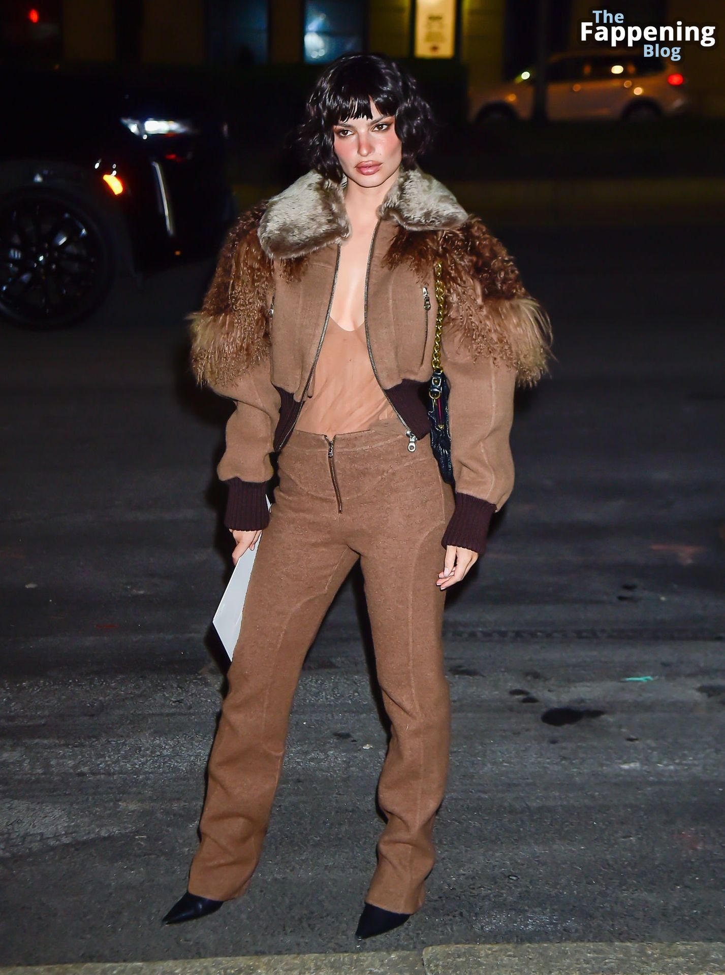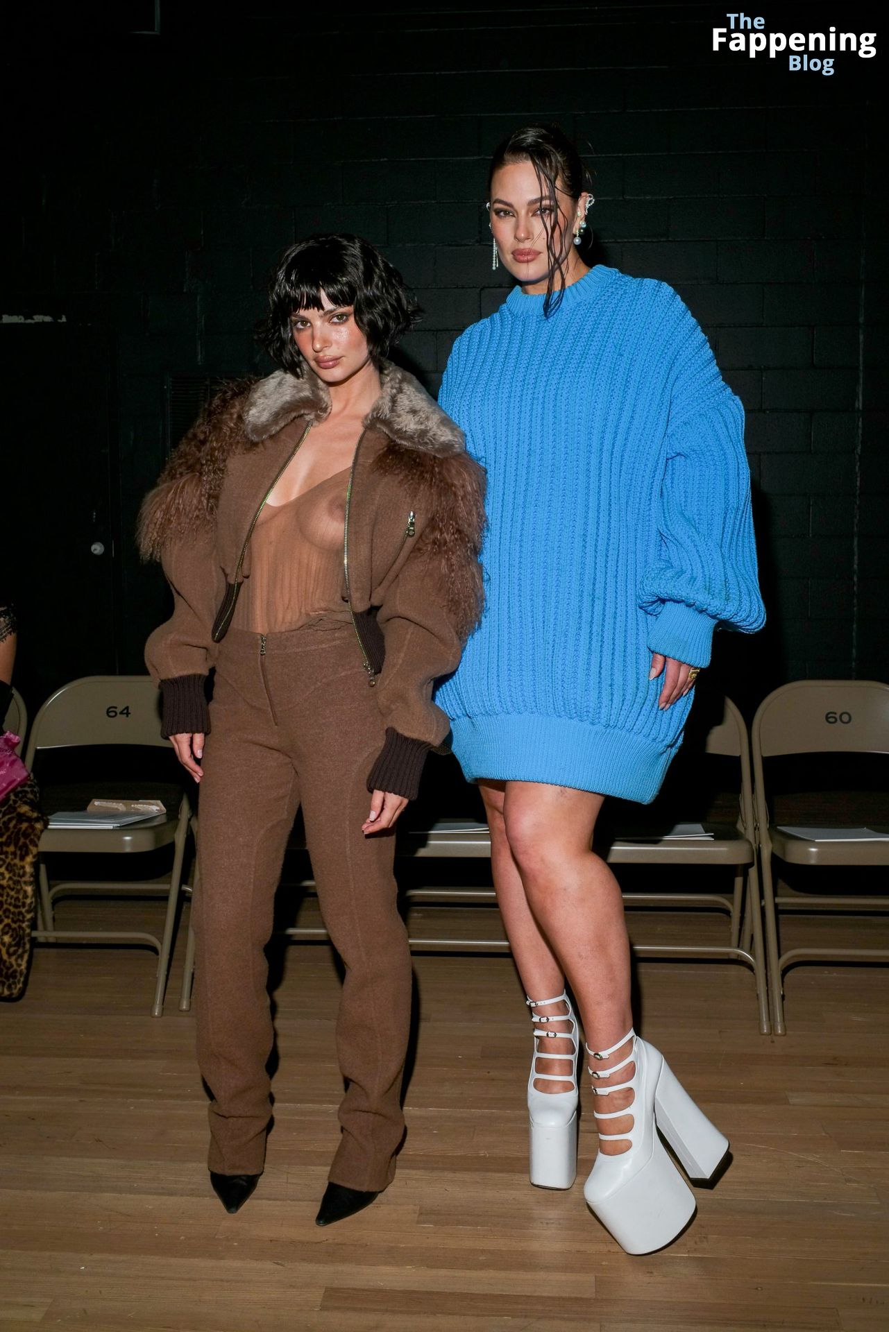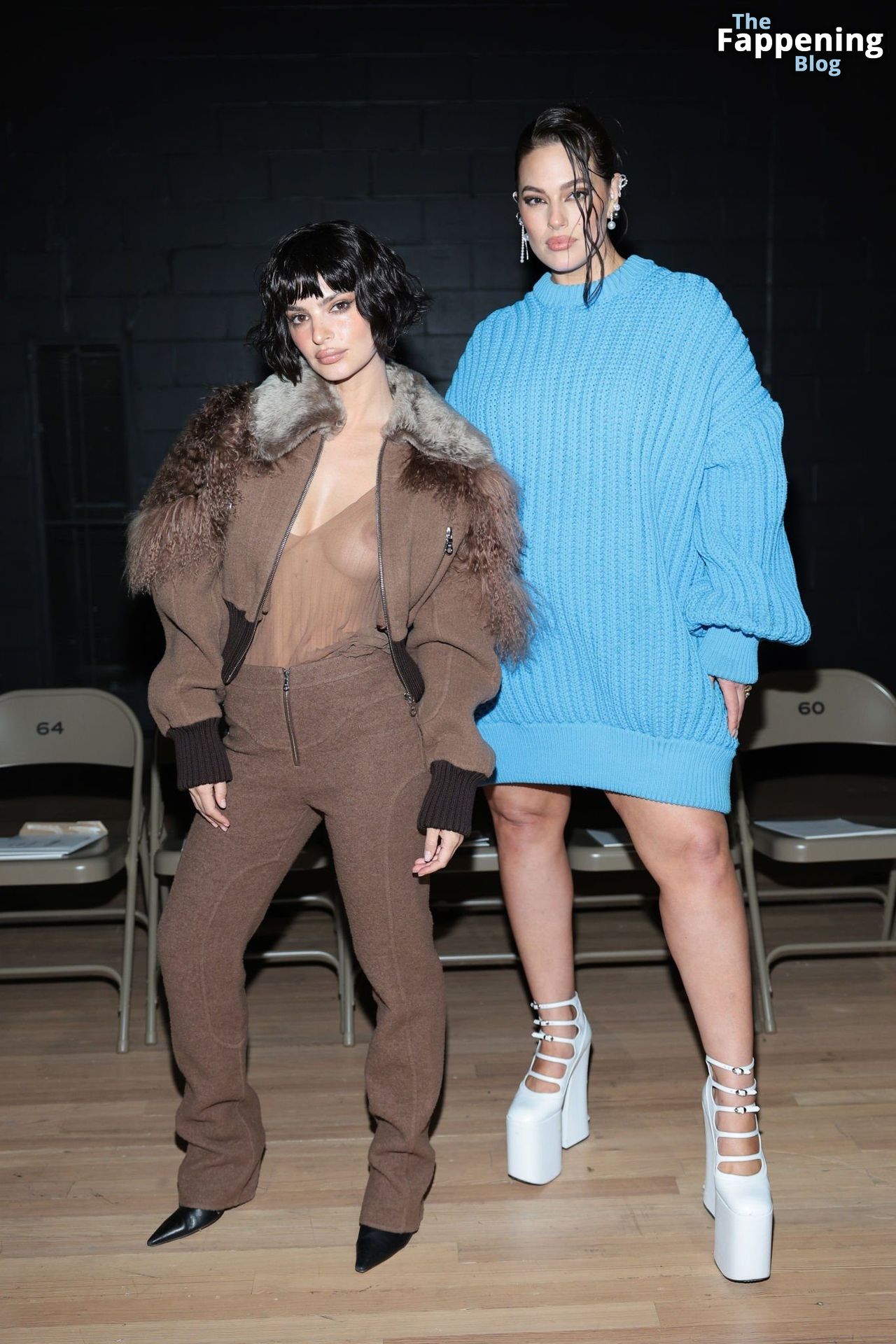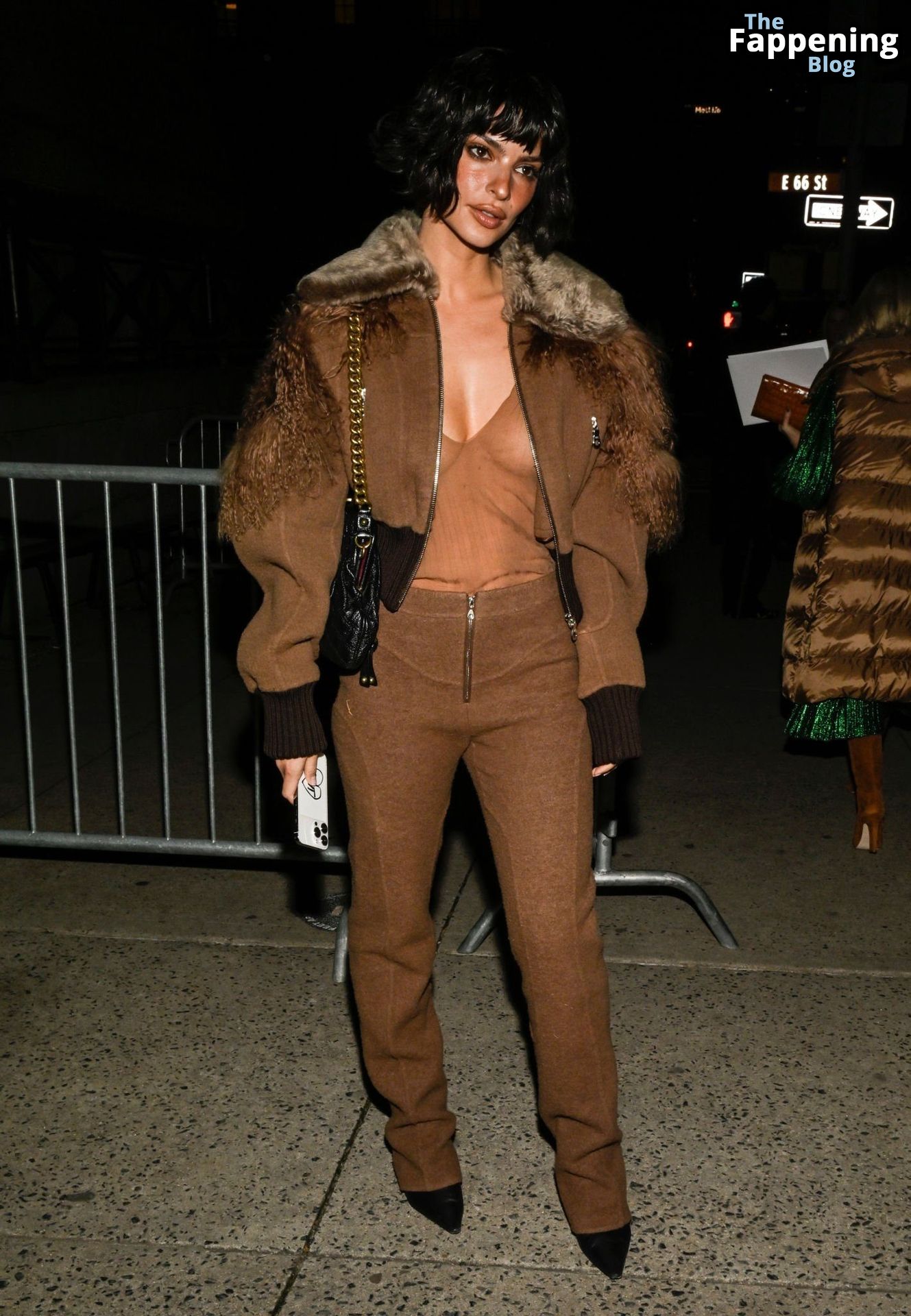 Emily Ratajkowski shows off her sexy braless boobs and nipples wearing transparent top as she attends Marc Jacobs runway show in New York