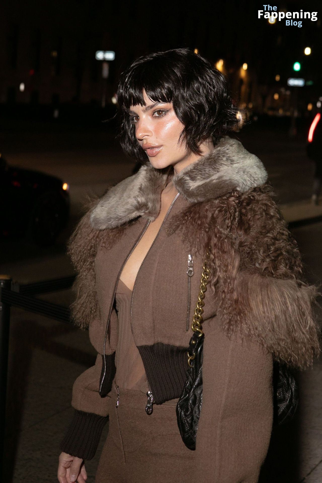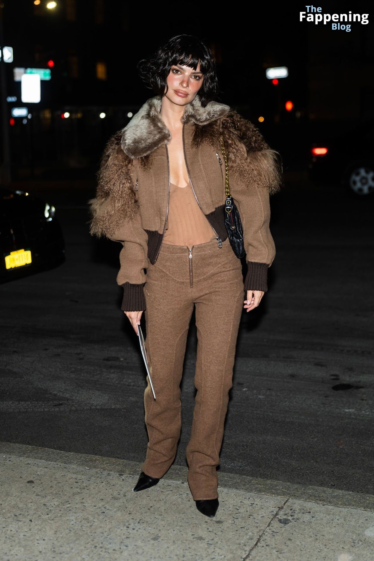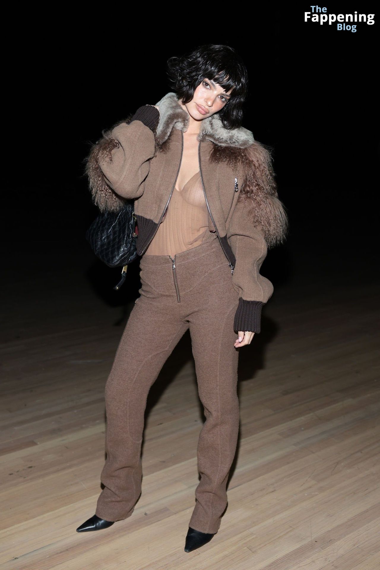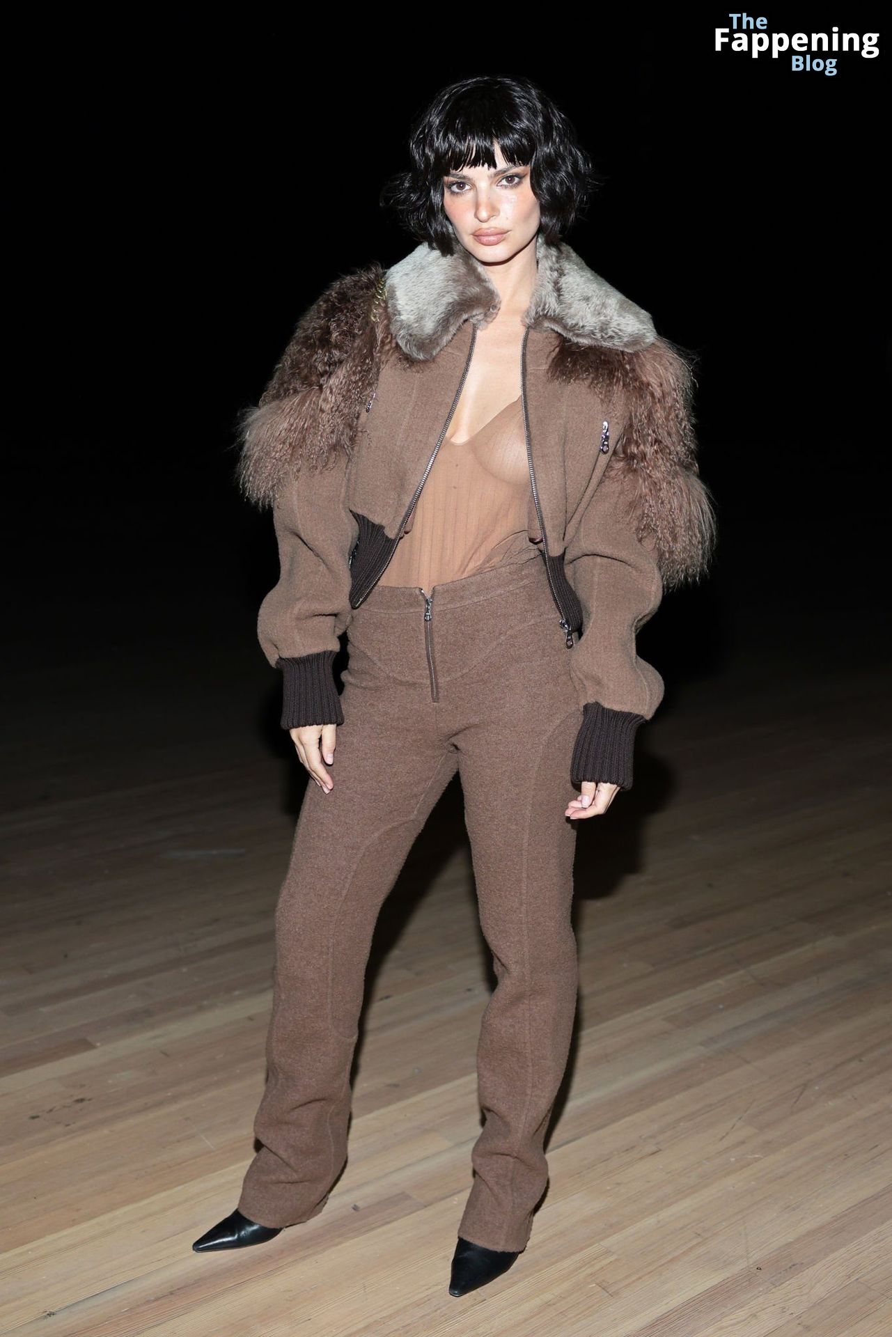 Emily Ratajkowski shows off her sexy braless boobs and nipples wearing transparent top as she attends Marc Jacobs runway show in New York
