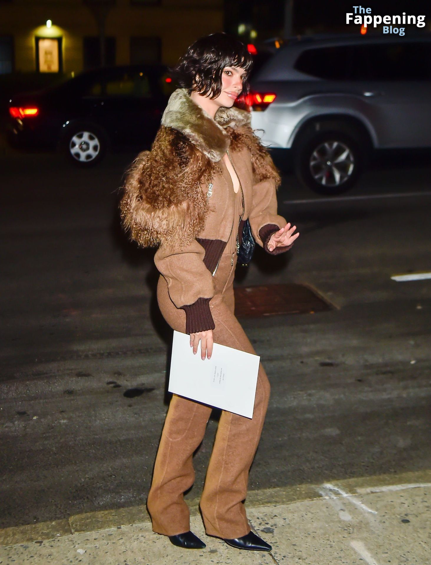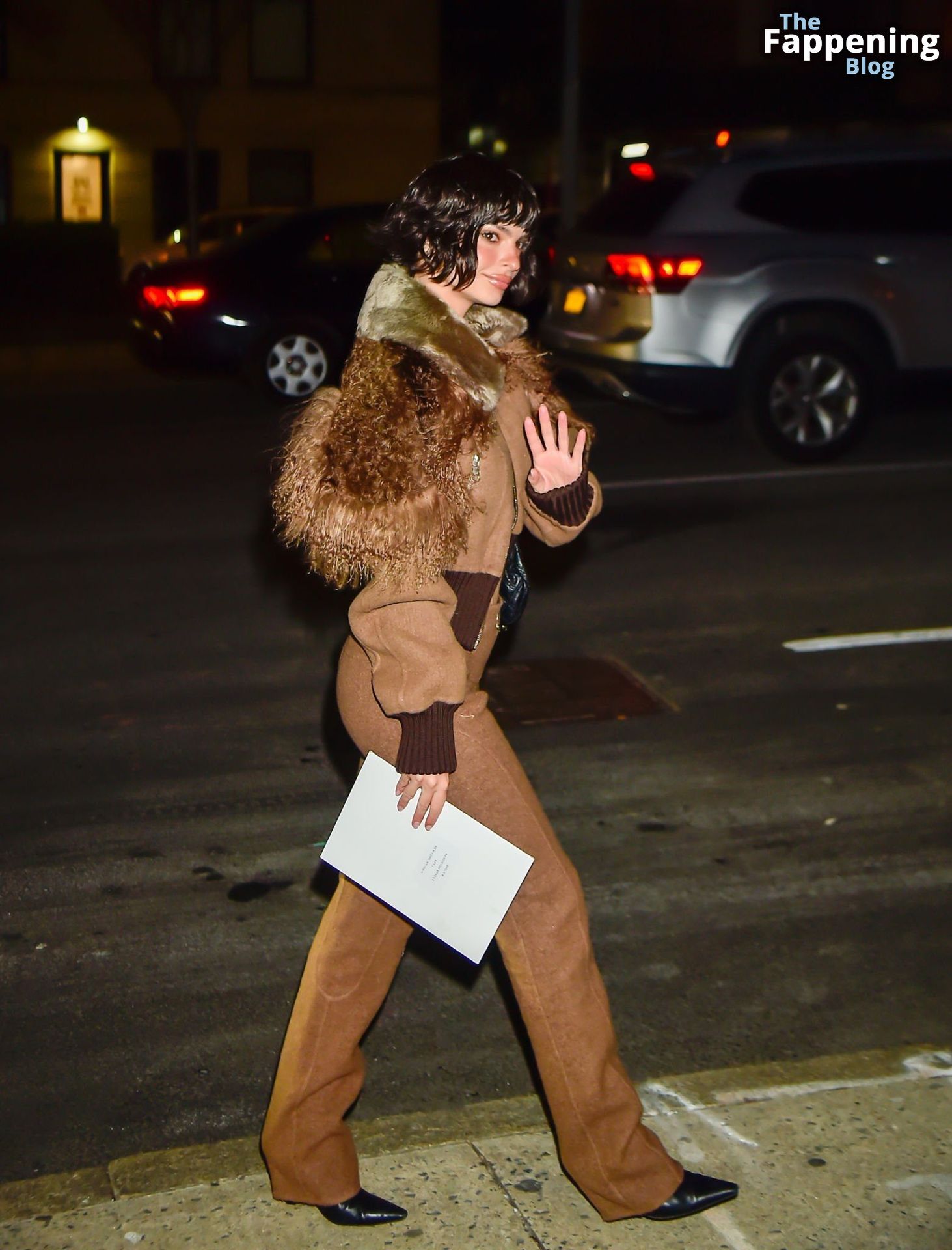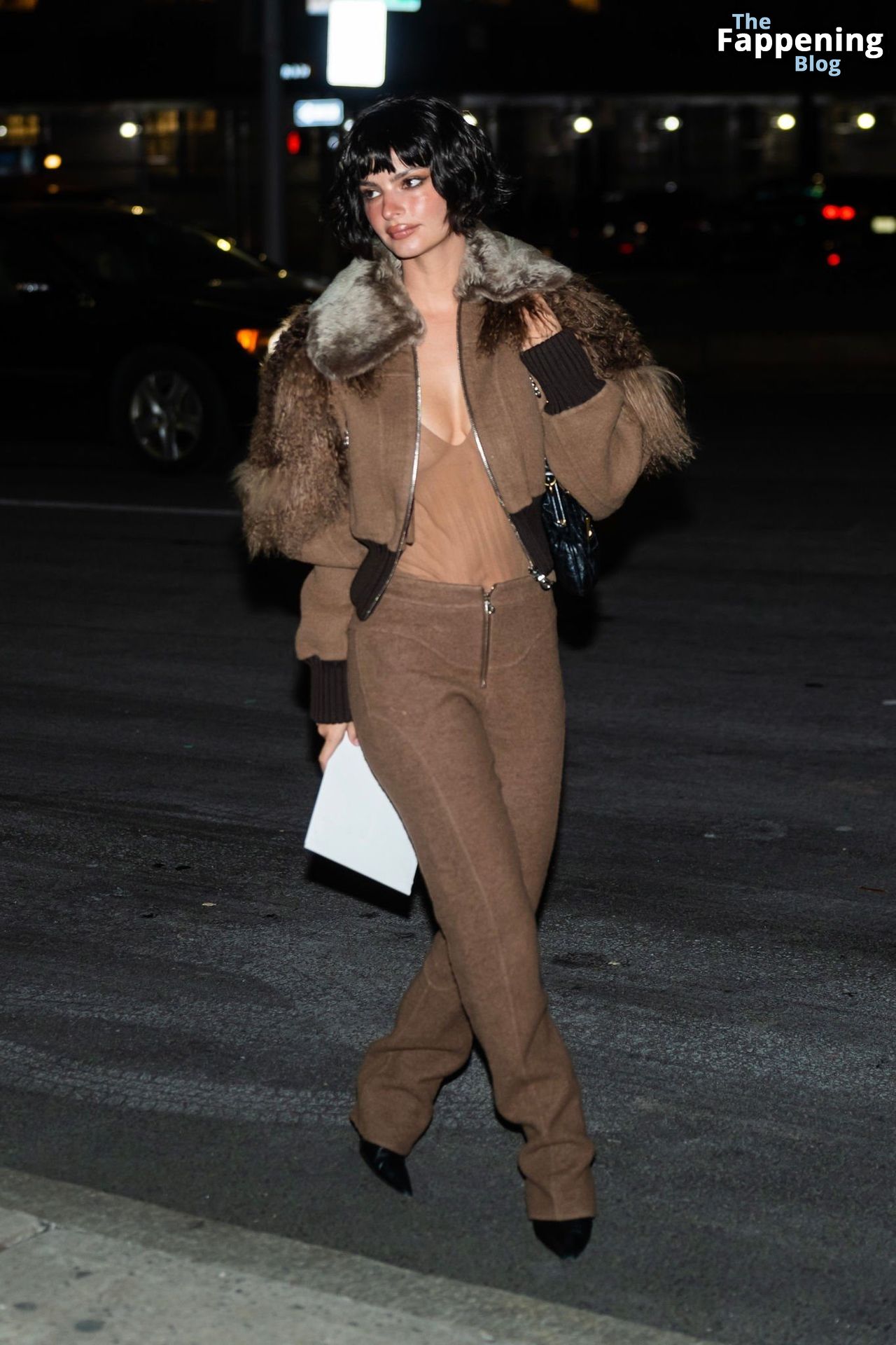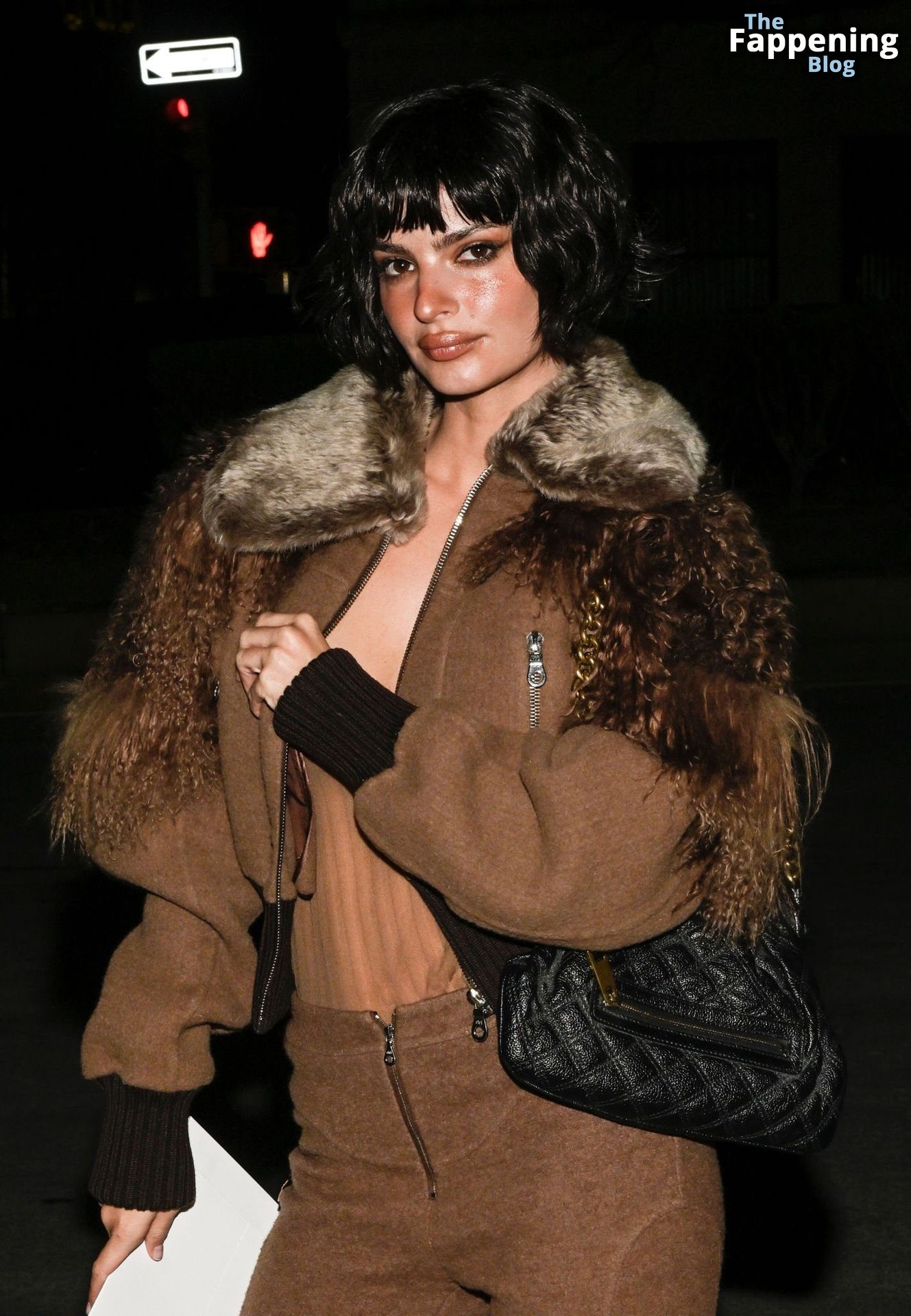 Emily Ratajkowski shows off her sexy braless boobs and nipples wearing transparent top as she attends Marc Jacobs runway show in New York