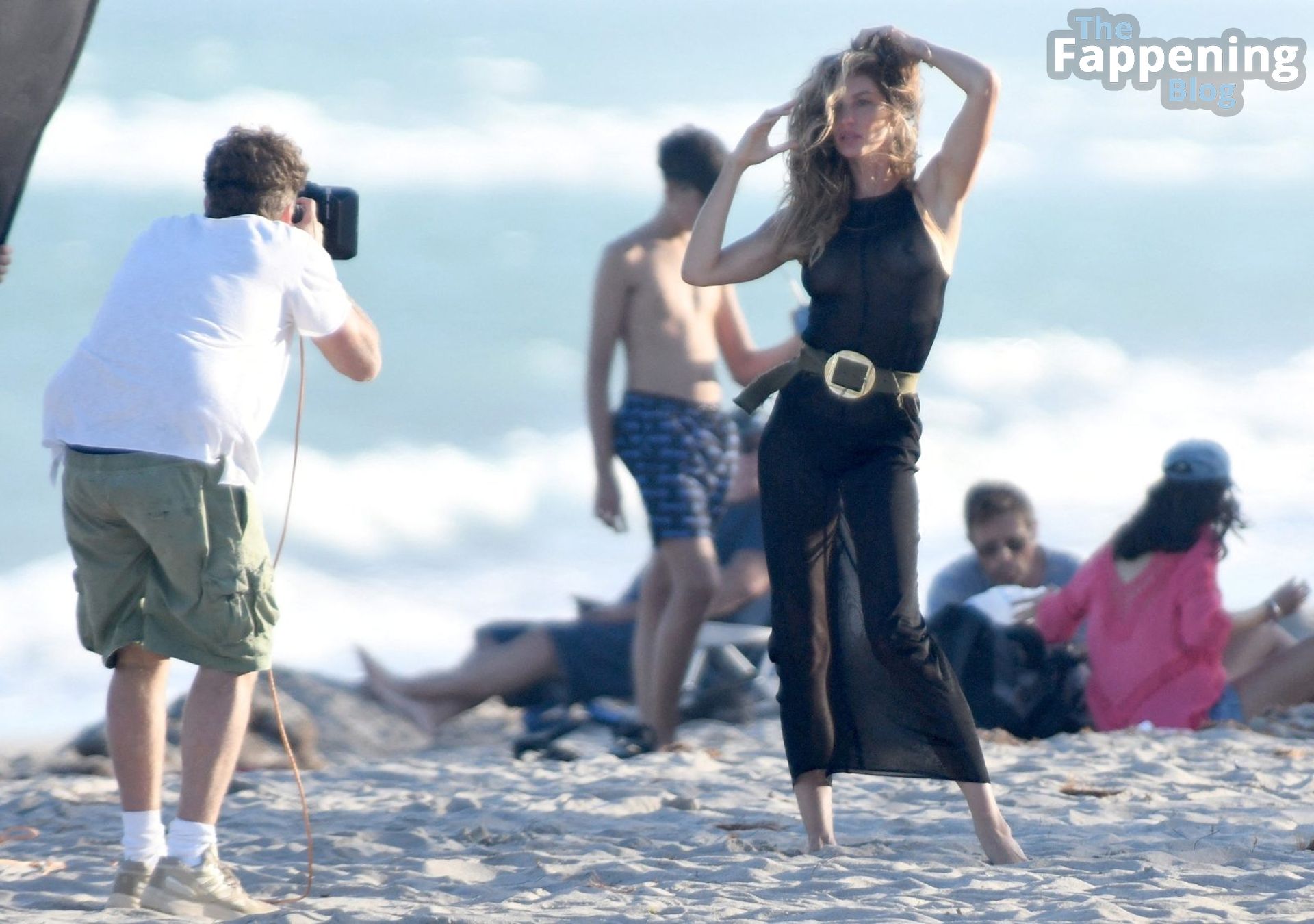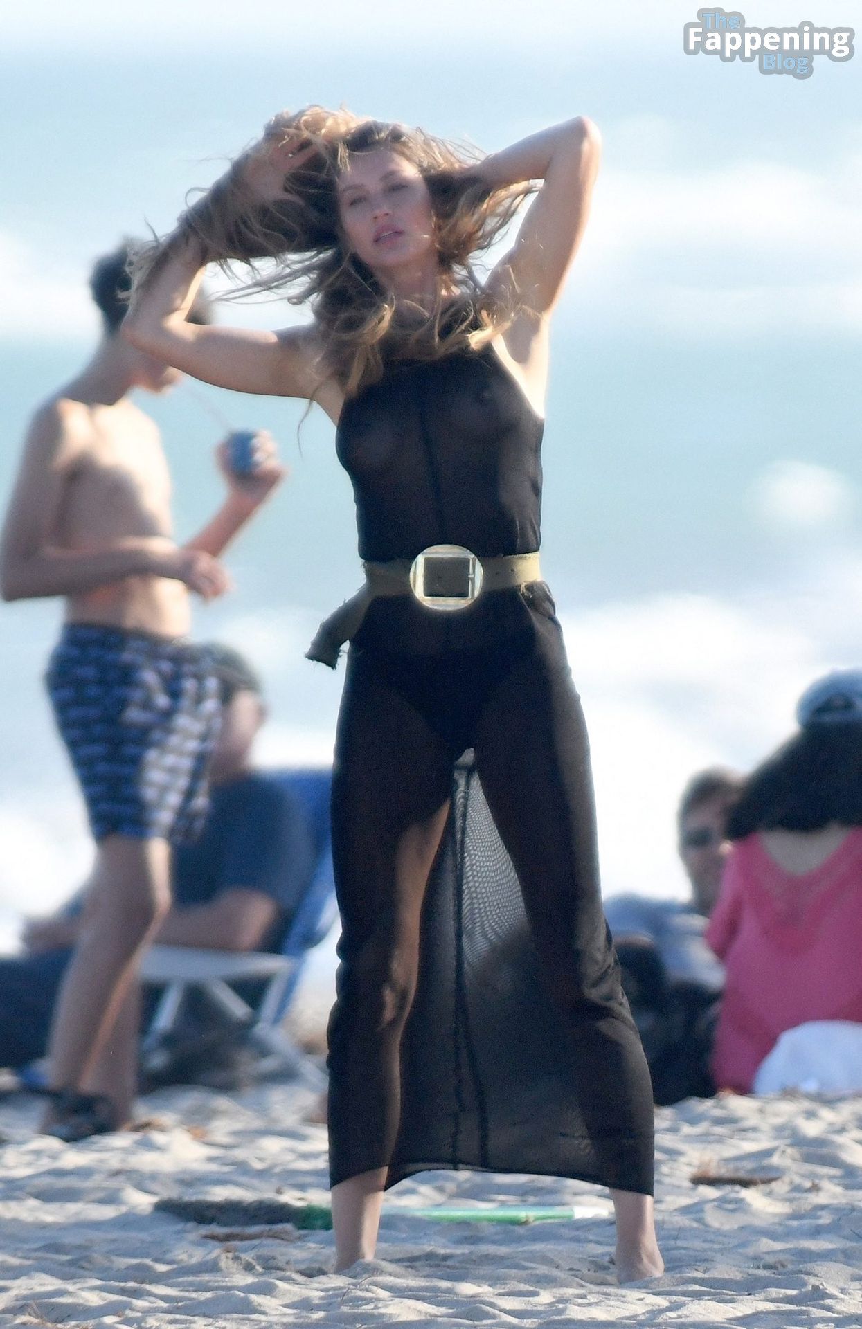 Gisele Bündchen shows off her boobs and nipples posing braless in a sheer outfit while doing a photoshoot at Miami Beach.