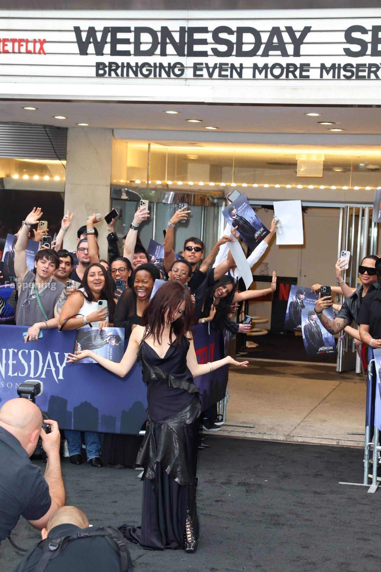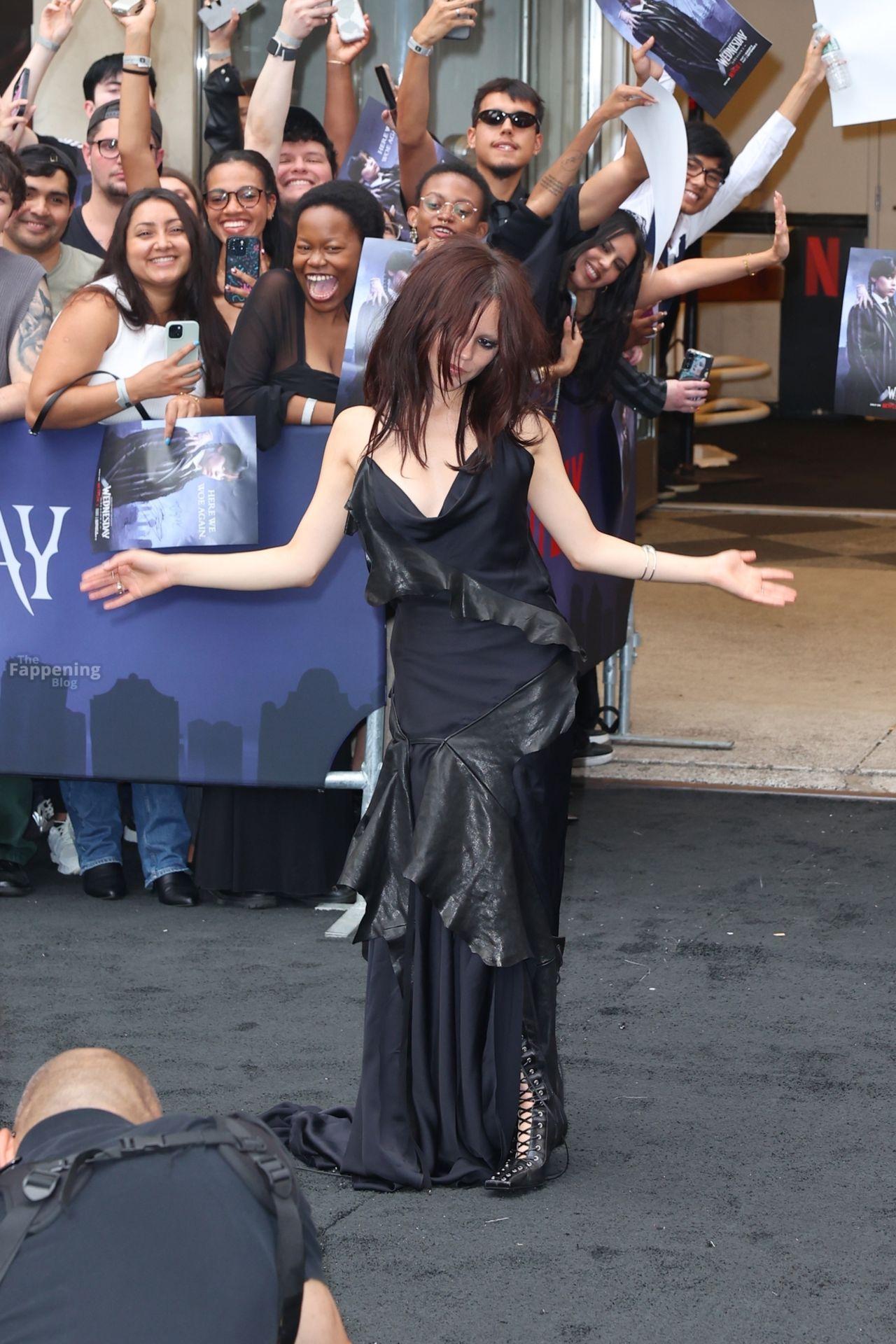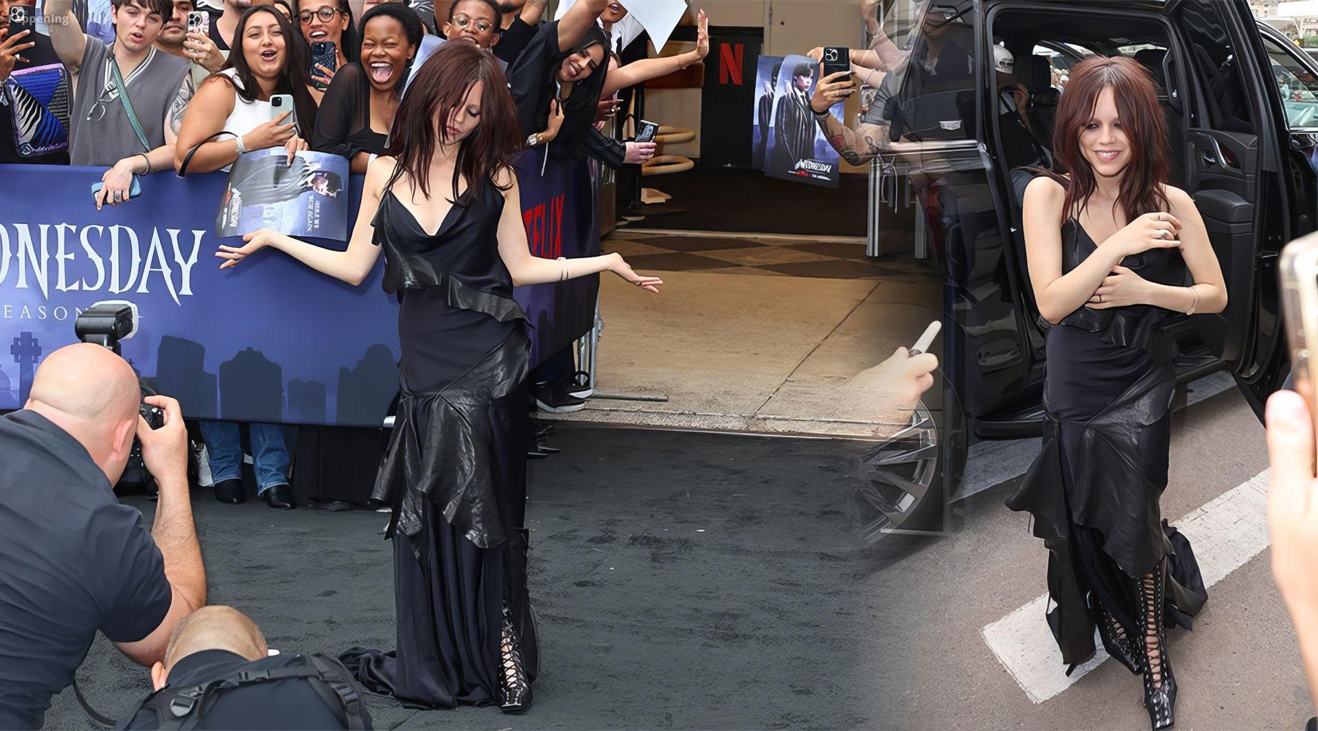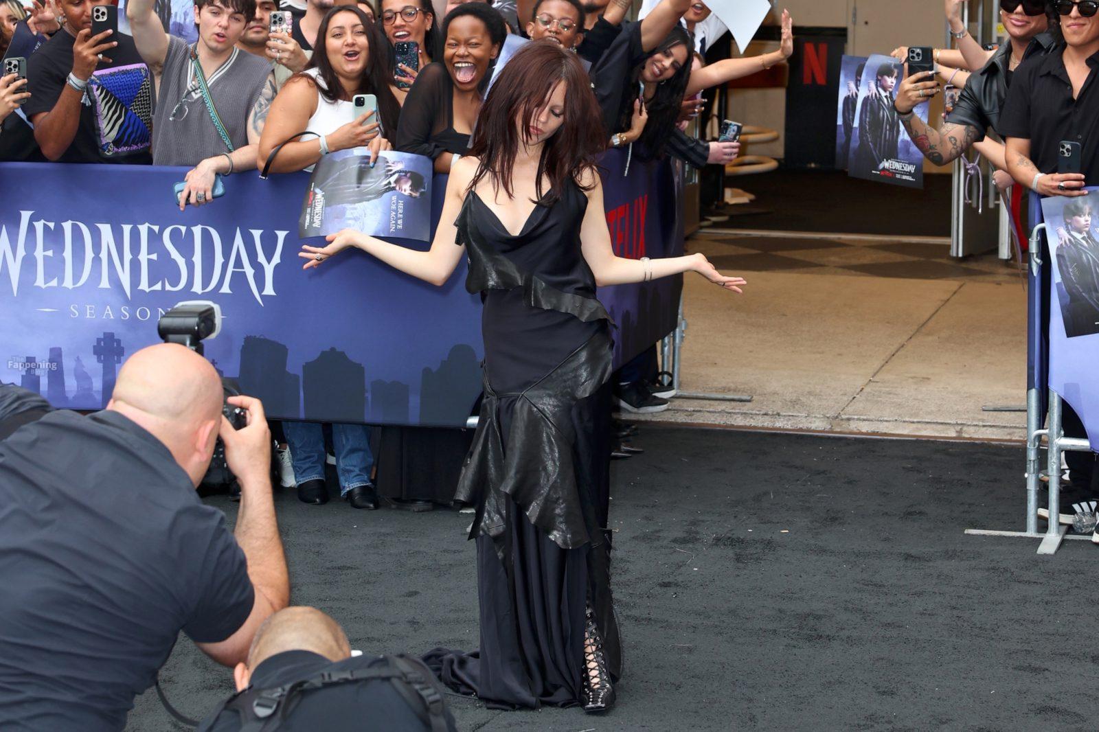 Jenna Ortega was pictured at the “Wednesday” Season 2 premiere in NYC, rockin’ a super low-cut black dress that showed off her tits. The actress, playin’ the iconic character, was all smiles posin’ for pics and chattin’ with fans at the big event.