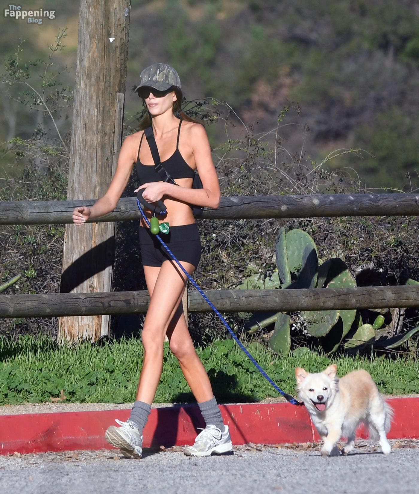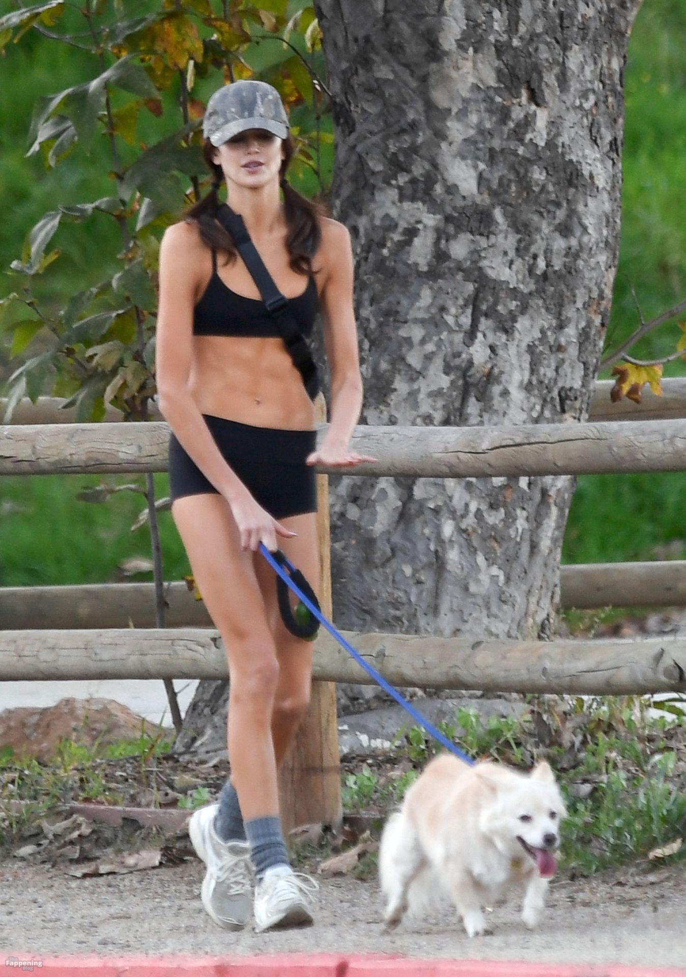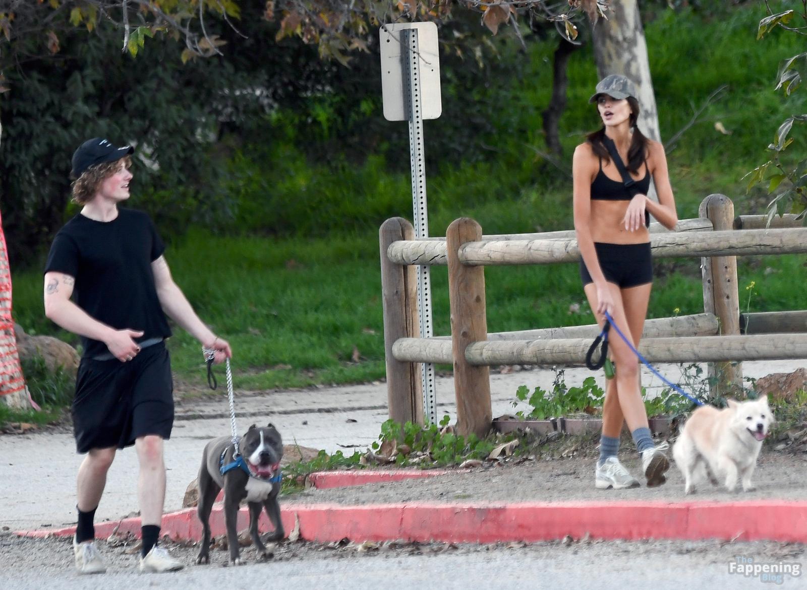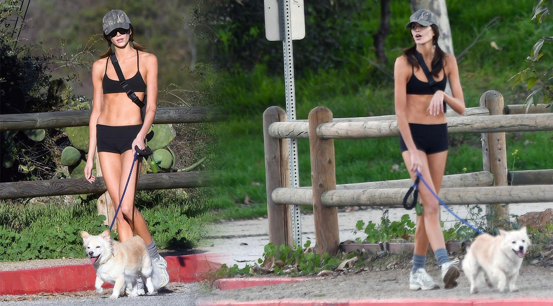 Leggy model Kaia Gerber was seen wearin’ a tiny sports bra and low-rise shorts in LA durin’ her dog walk.
