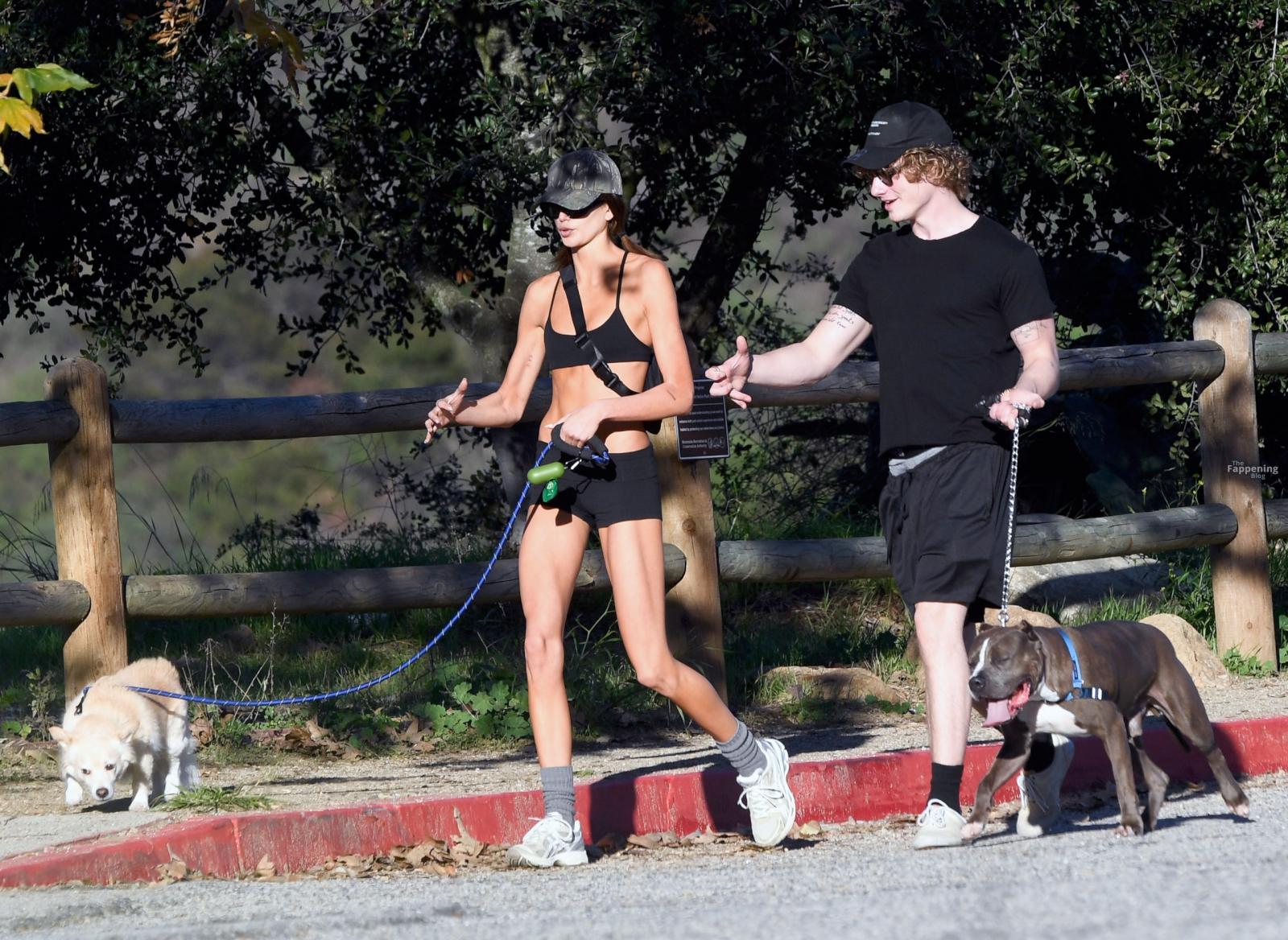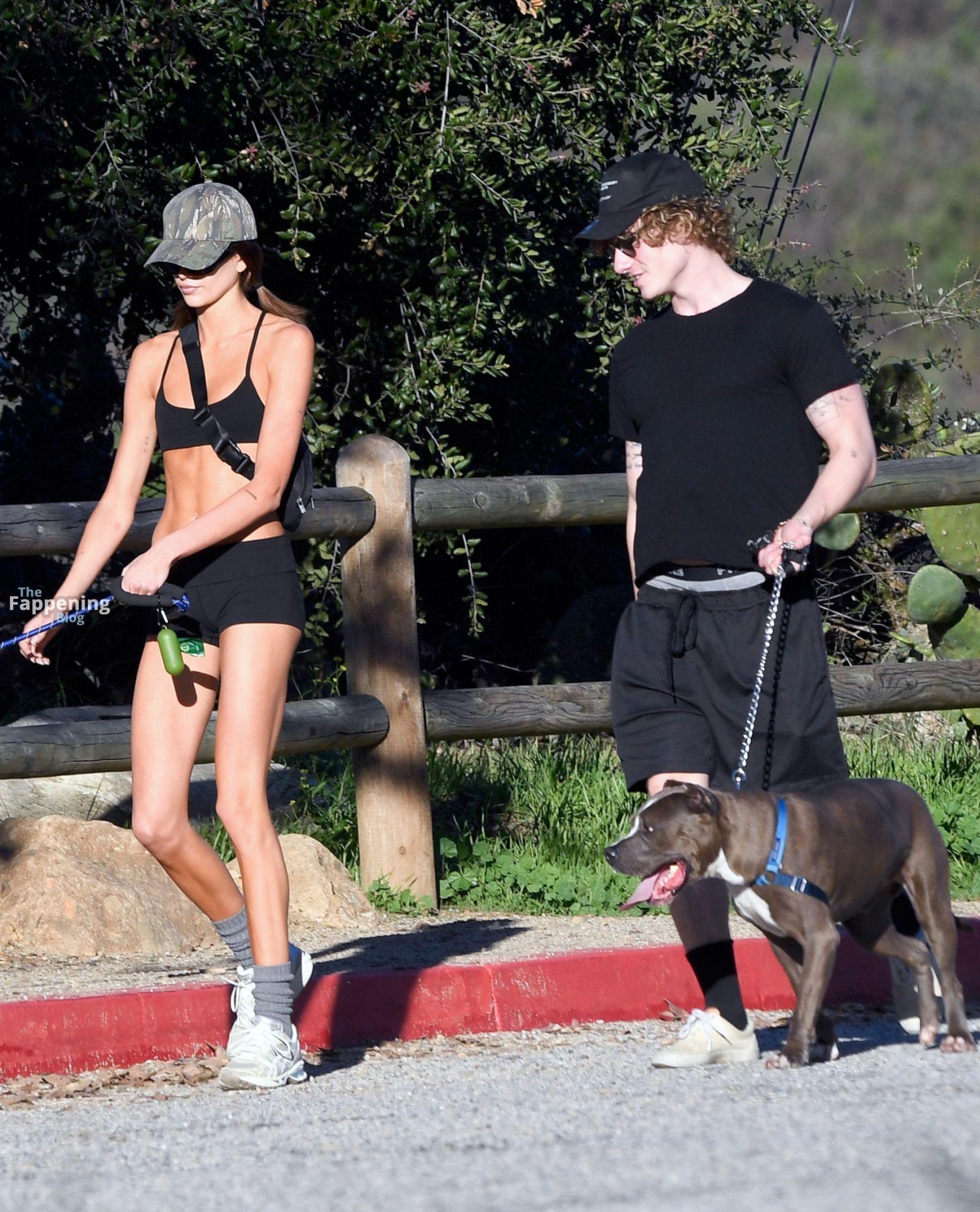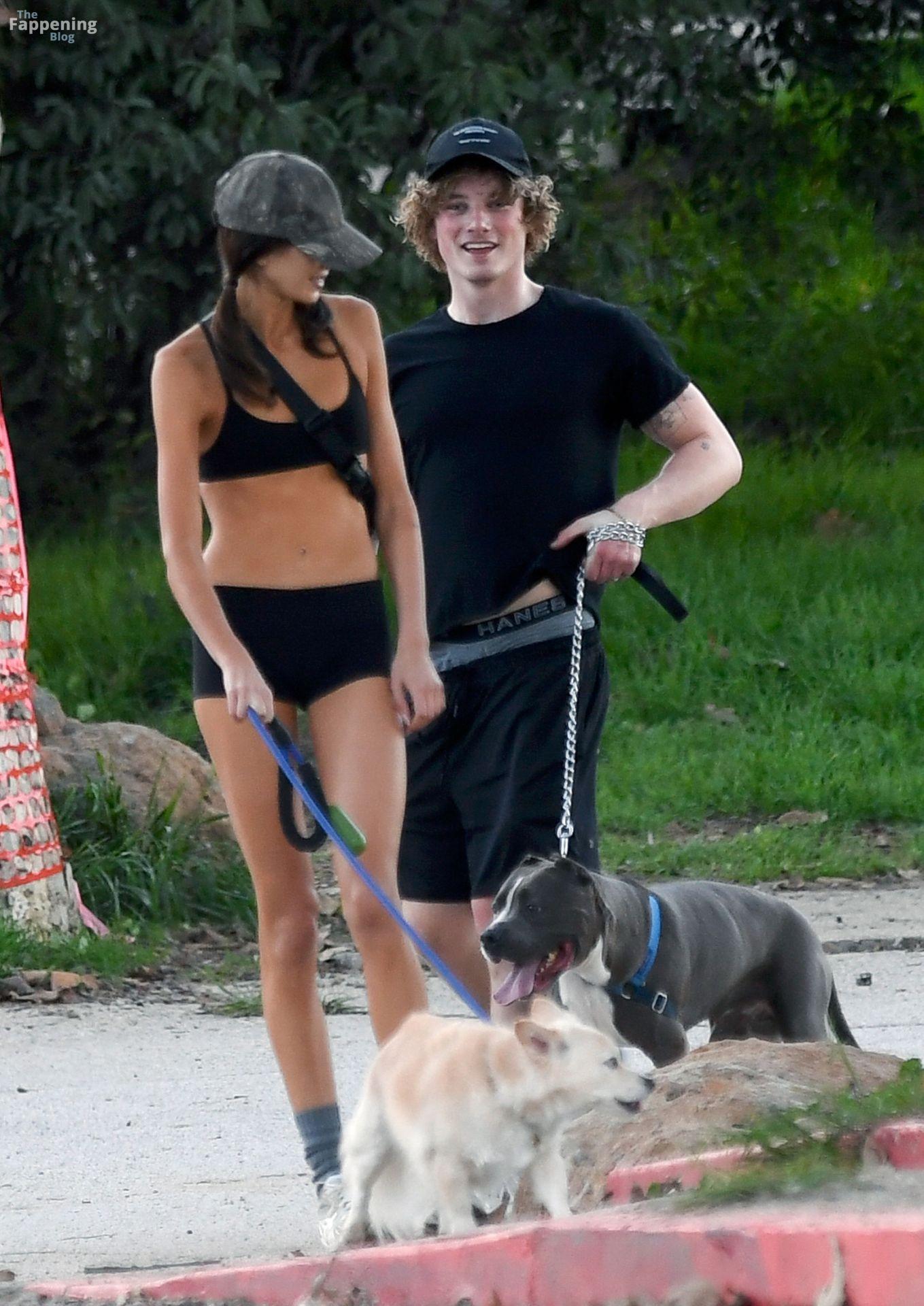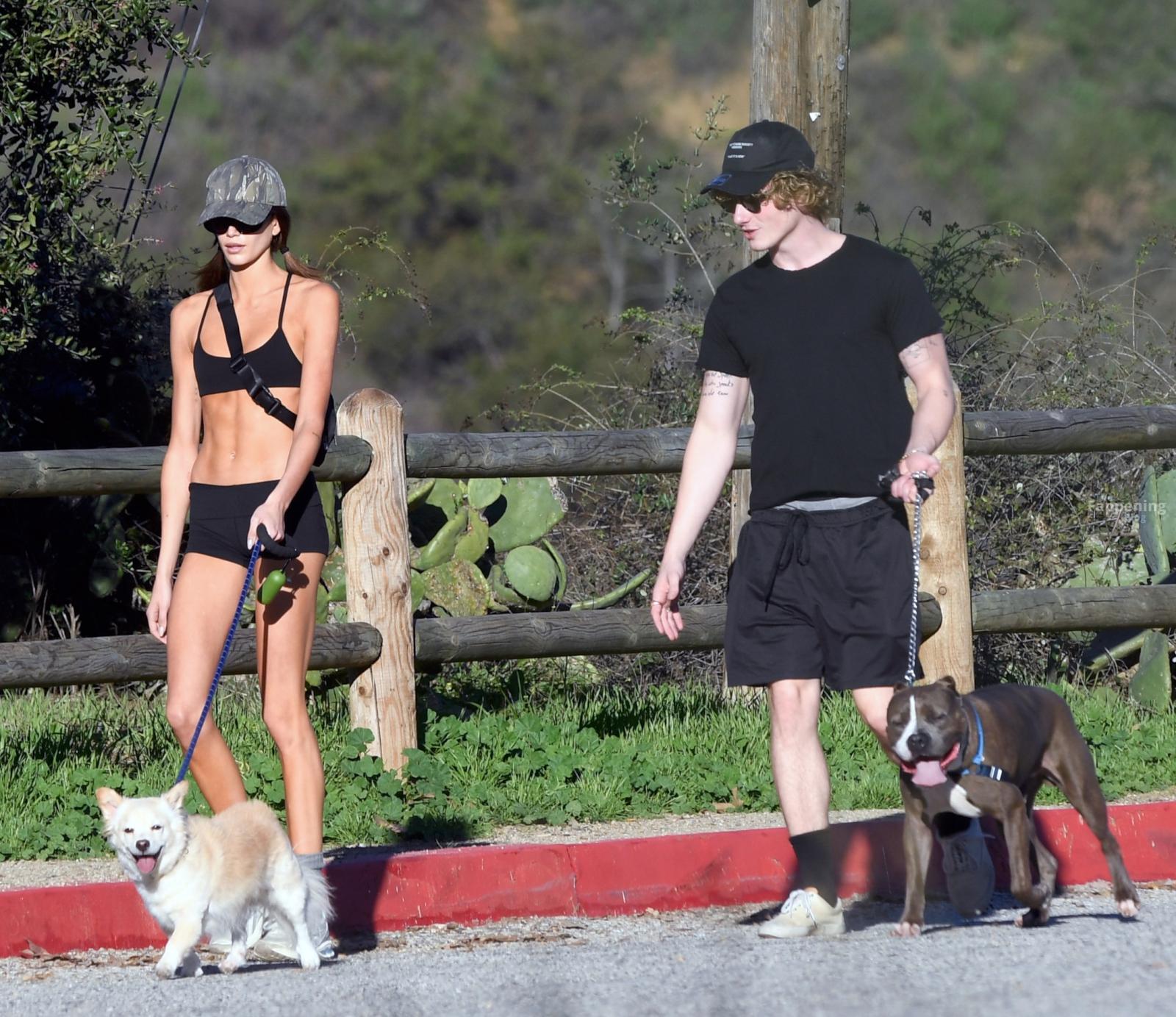 Leggy model Kaia Gerber was seen wearin’ a tiny sports bra and low-rise shorts in LA durin’ her dog walk.