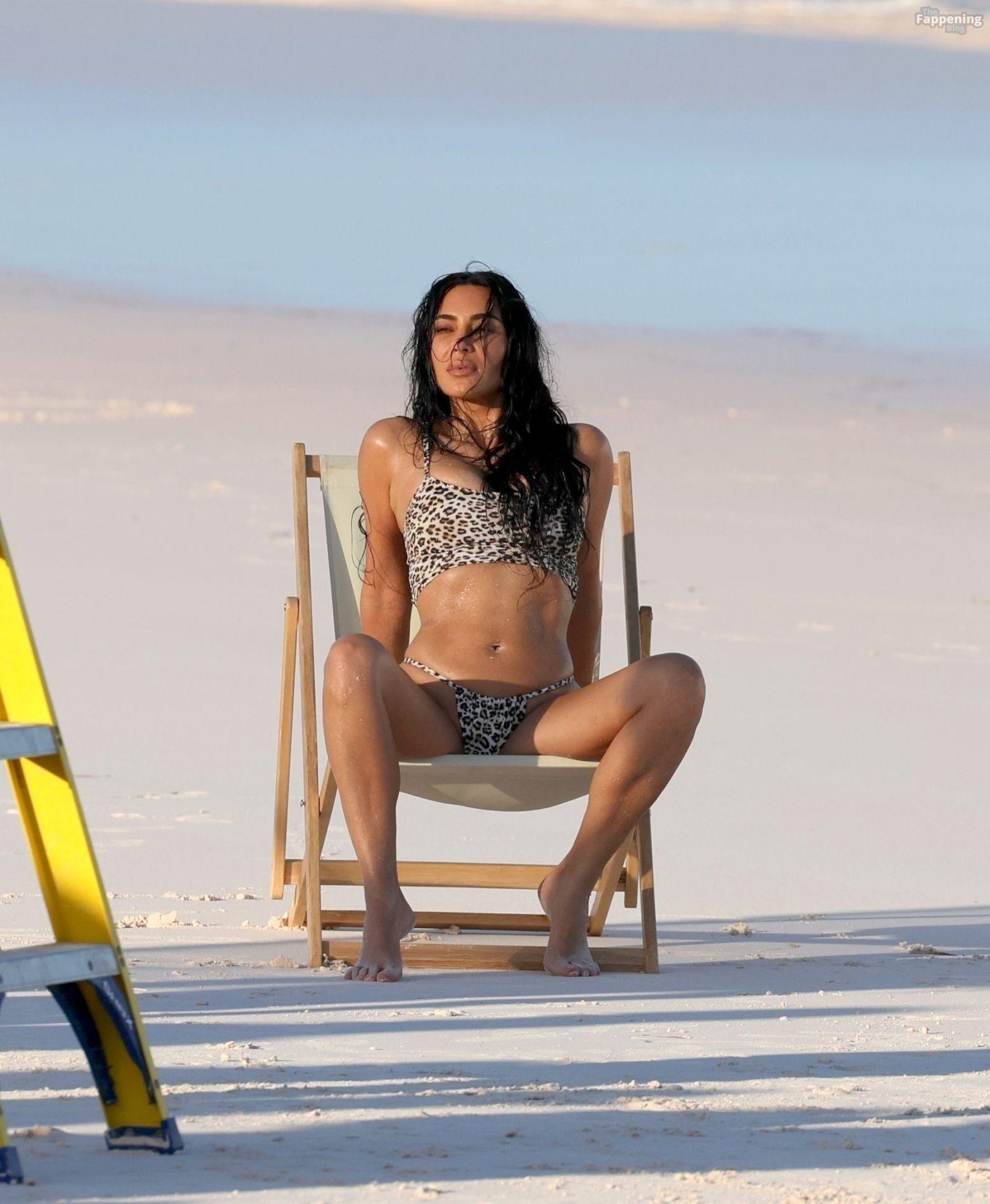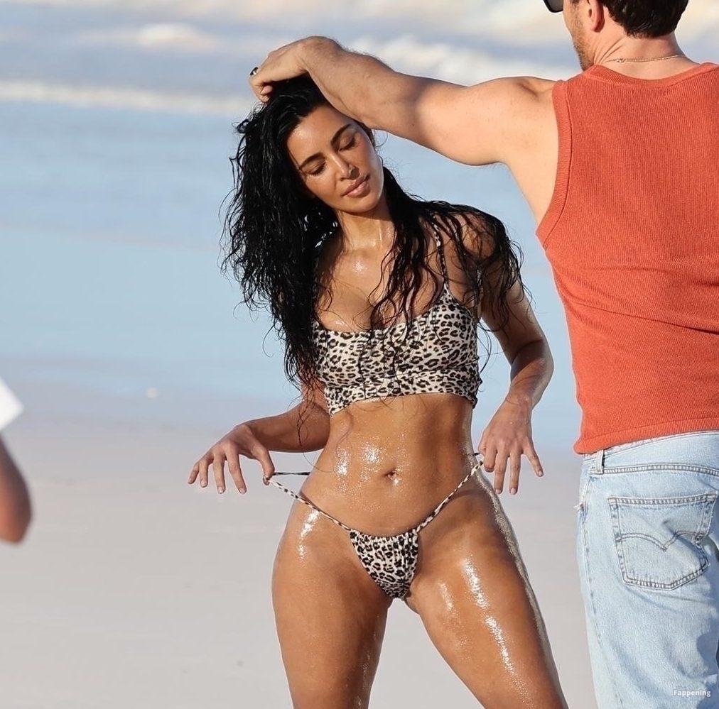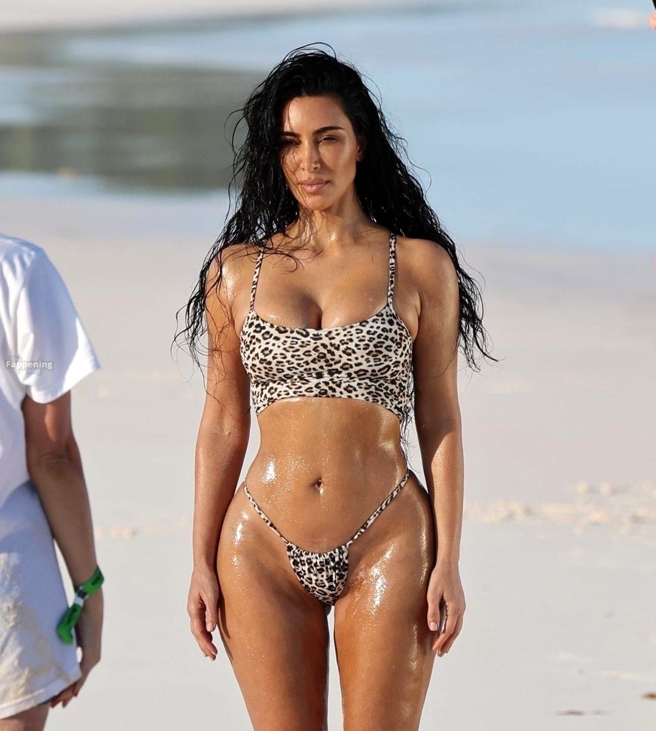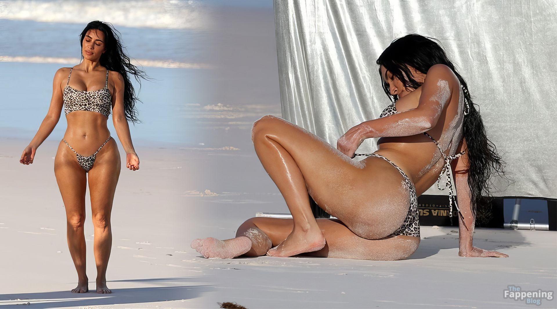 Kim Kardashian strikes a pose as she rolls in the sand while wearing a sexy leopard-print bikini enjoying a beachside shoot.
