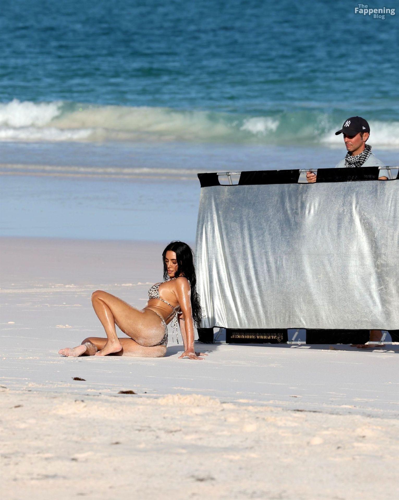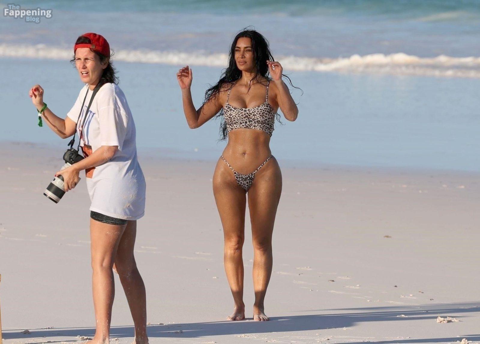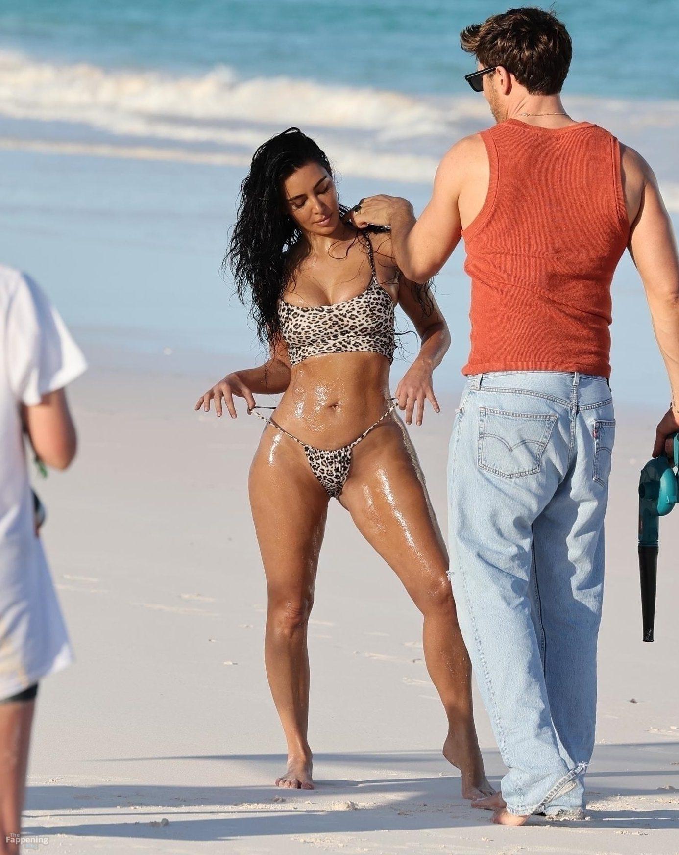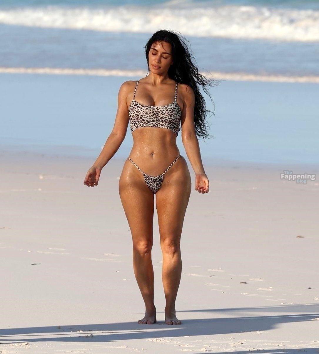 Kim Kardashian strikes a pose as she rolls in the sand while wearing a sexy leopard-print bikini enjoying a beachside shoot.