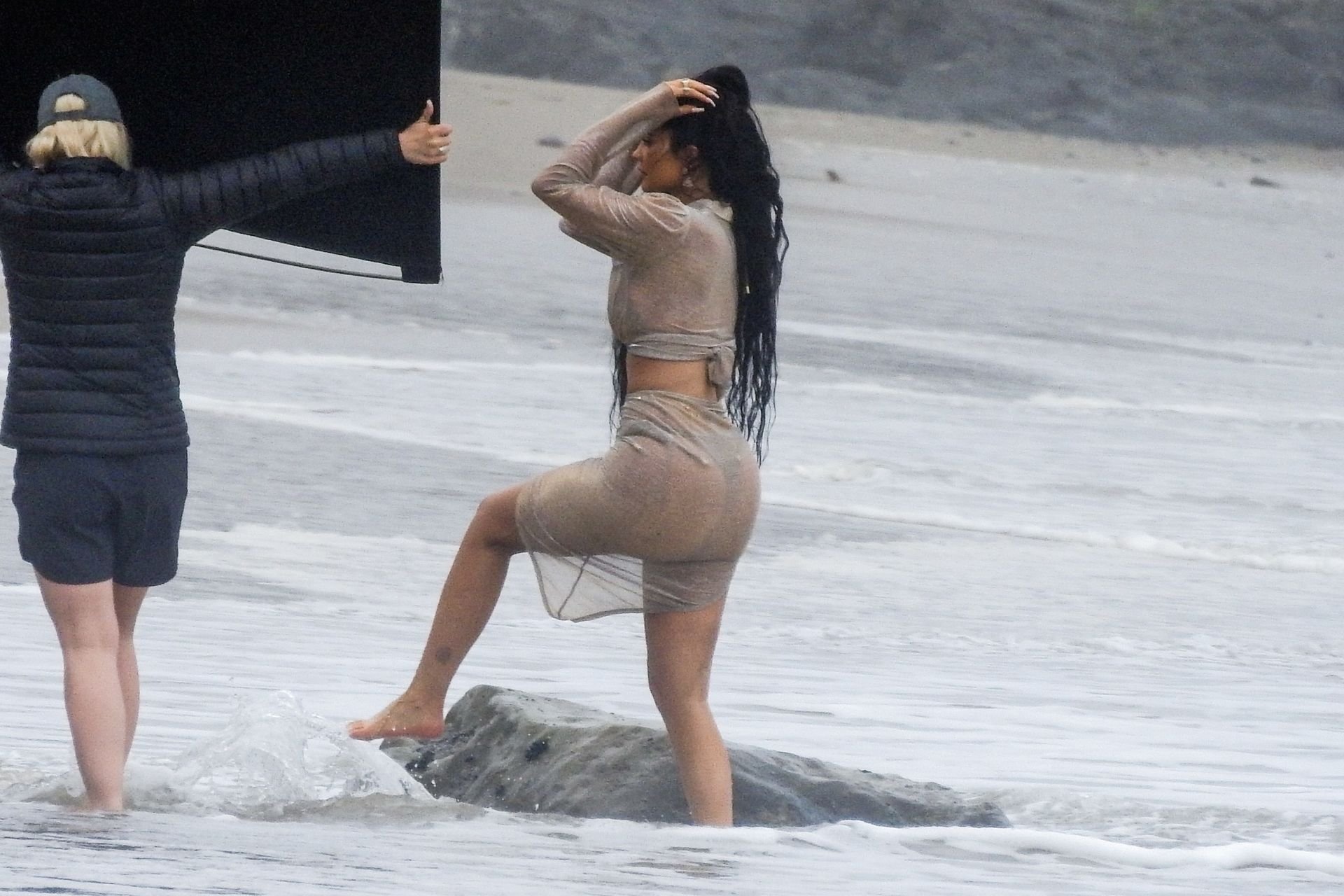 In another setup, Kylie wore a bikini top and sequin skirt and oversized beach hat while posing on the sand in front of a mirror. Plenty of crew was on hand to help, and one luck assistant had the grueling task of misting her with a water bottle making sure she had the right amount of water and sand sticking to her legs.