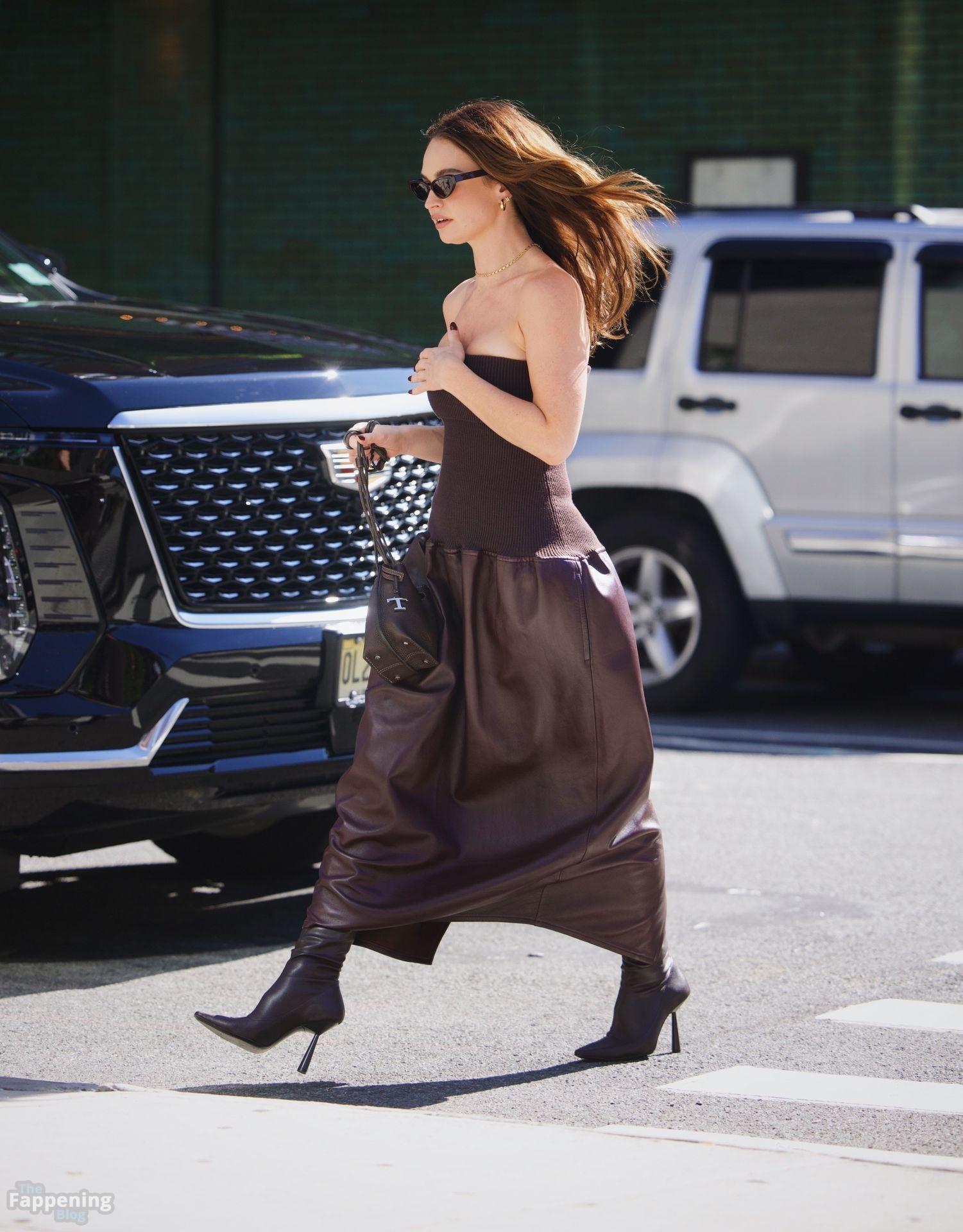 Lily James was caught grabbin’ a stylish lunch in NYC on Thursday afternoon. The actress, hustlin’ on a press tour, took a breather at Gemma in Noho for some grub. She was rockin’ a fall color scheme with a brown leather Tod’s dress, a matchin’ bag, and Gia Borgini knee-high boots.