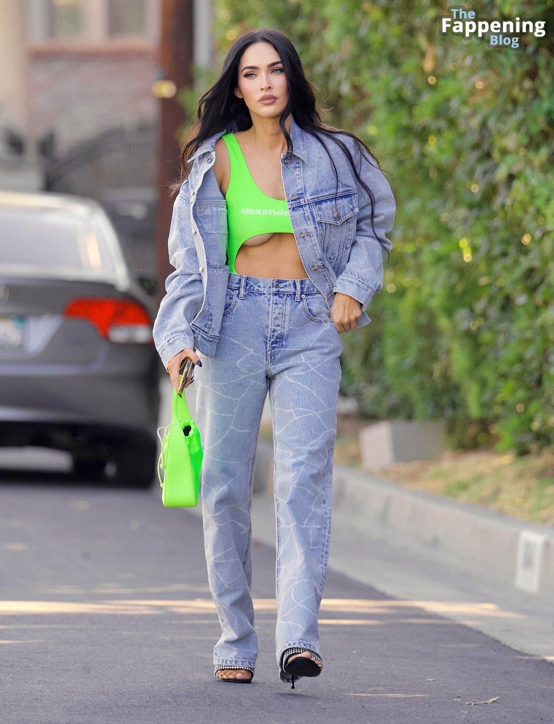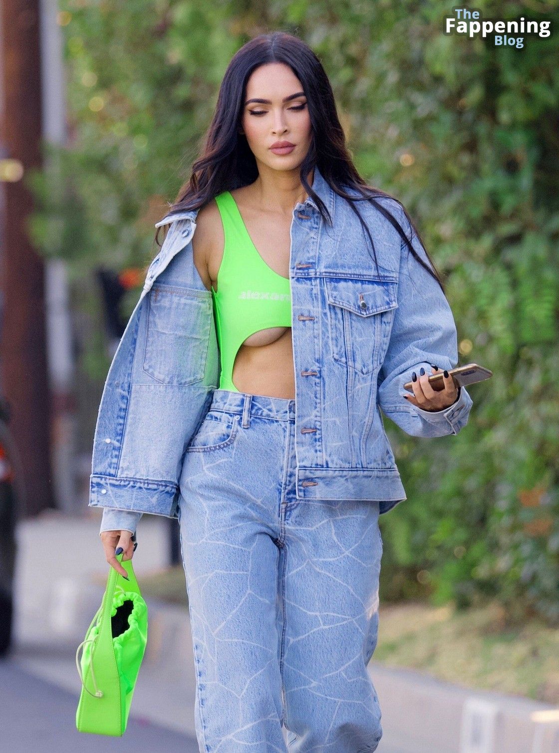 This look isn’t just about her personal life – it’s also a huge change in stylists. This is a seriously sexy autumn outfit. That oversized Alexander Wang denim set, with the cool marble-y texture, is a total head-turner. But honestly, everyone’s staring at Megan’s neon swimsuit with its super-low cut—it’s practically showing her cleavage. Megan’s figure is, as always, incredible.