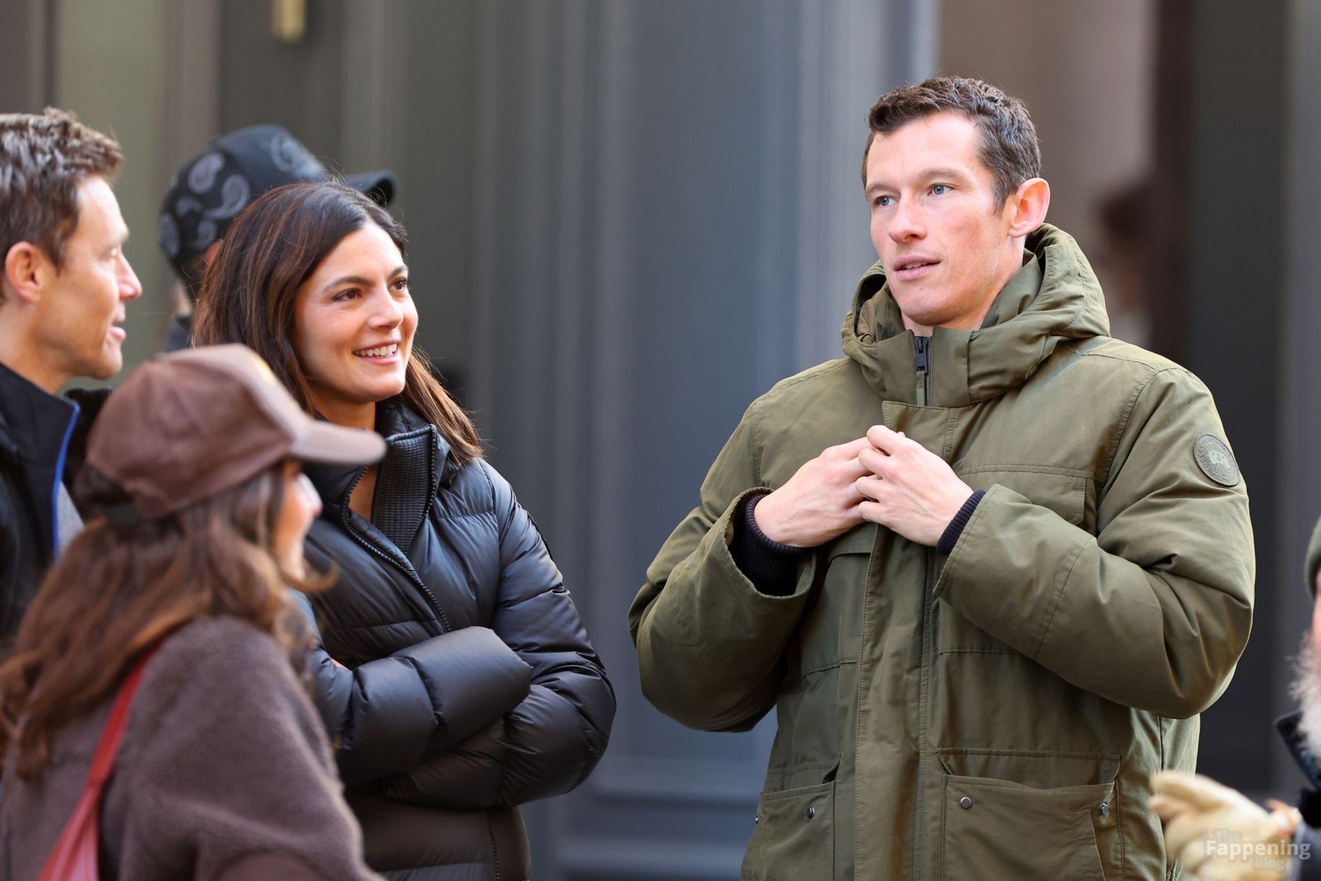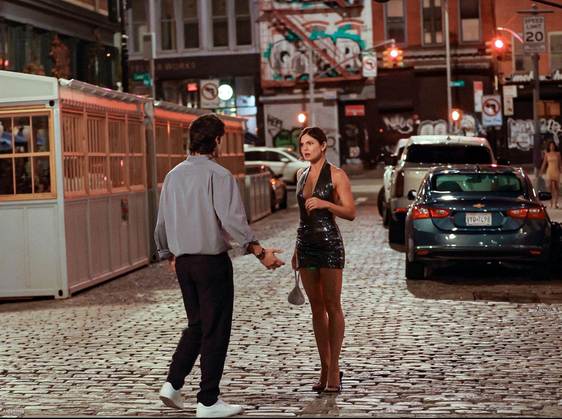 Braless Monica Barbaro stuns in a green sequin dress and stiletto high heels filming ‘One Night Only’ in New York City.