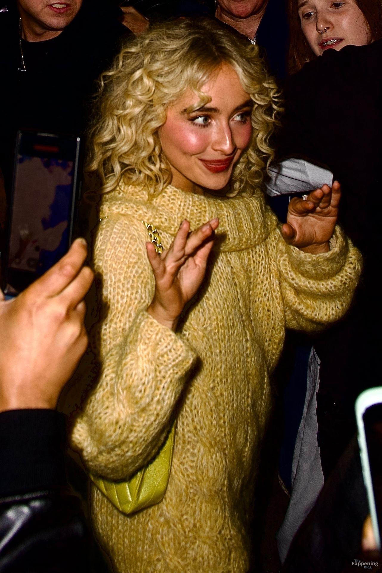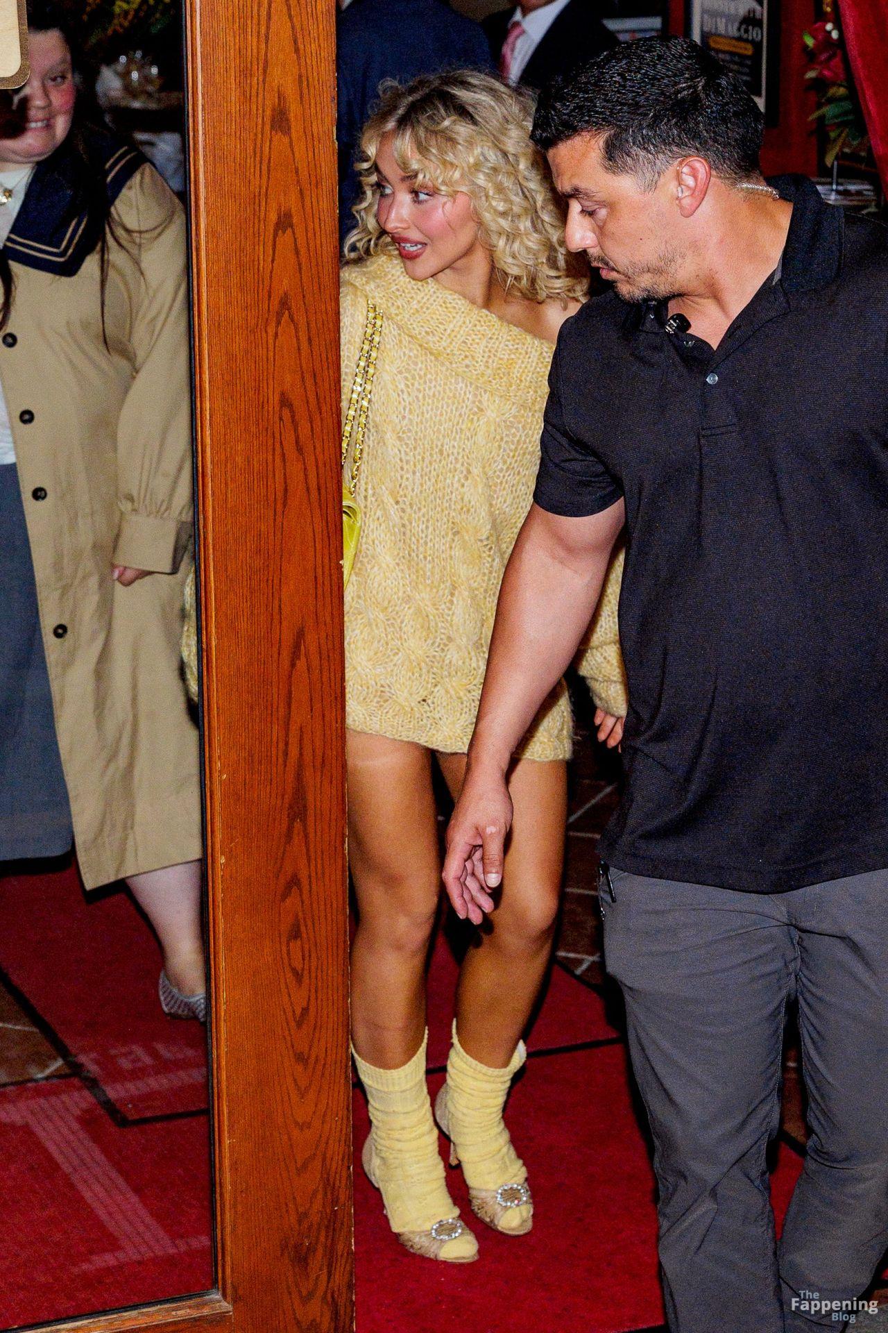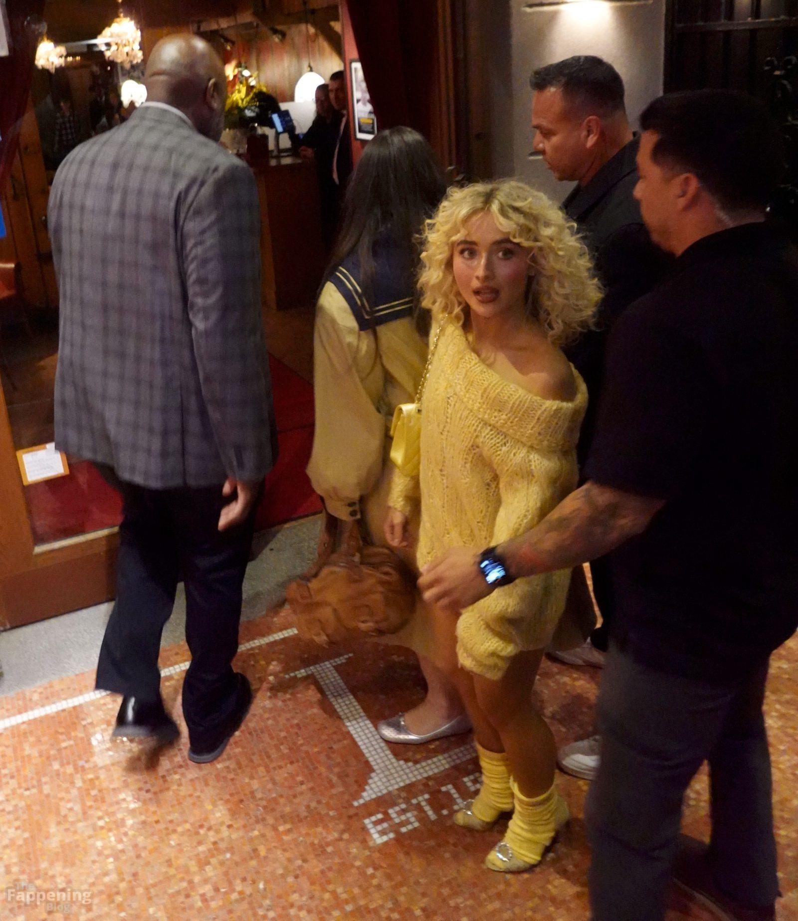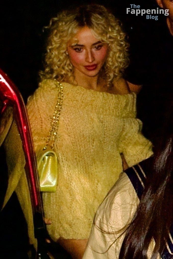 Sabrina Carpenter showed off her legs in a bold no-pants golden sweater, rockin’ curls and a mini bag at an SNL dinner in NYC.
