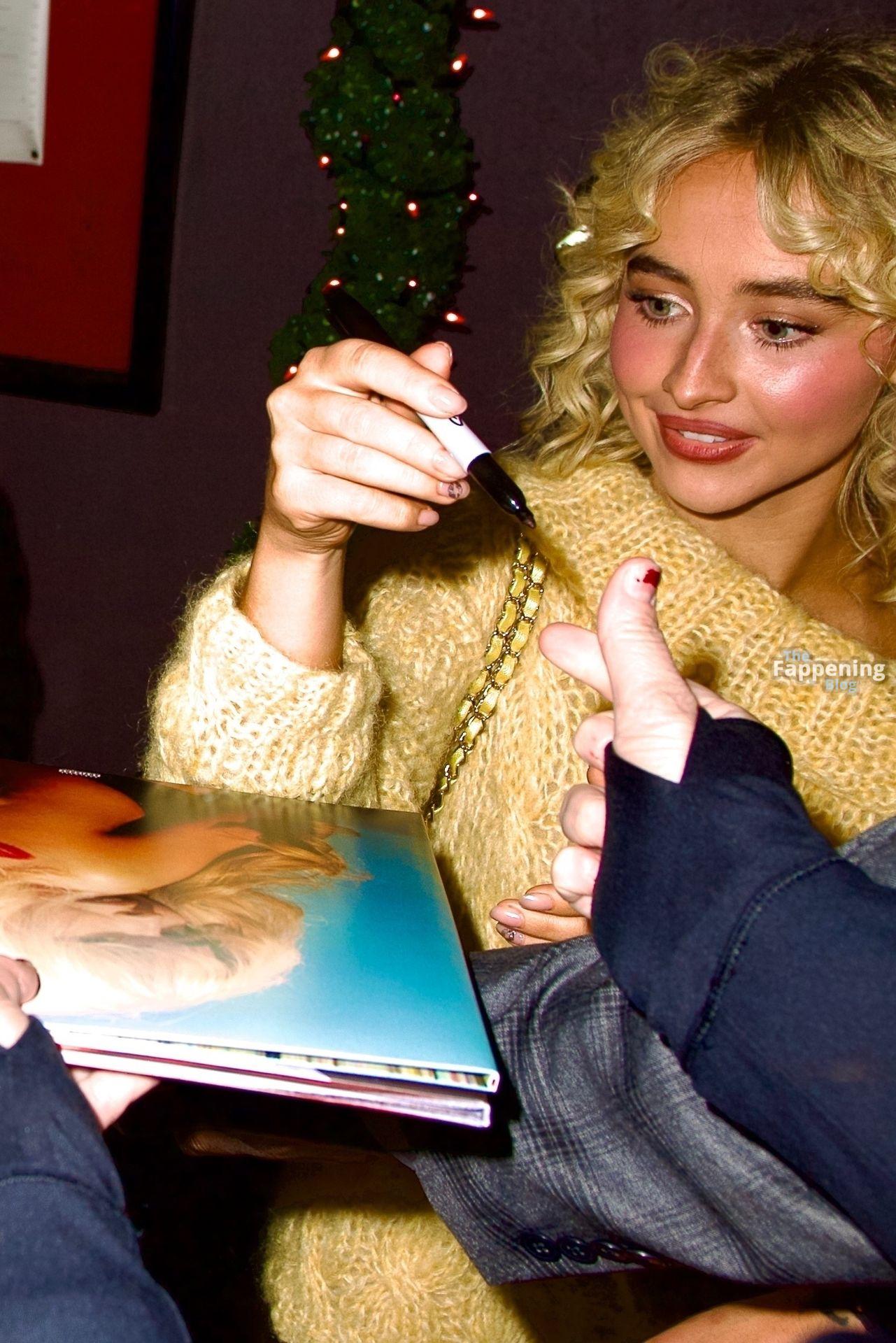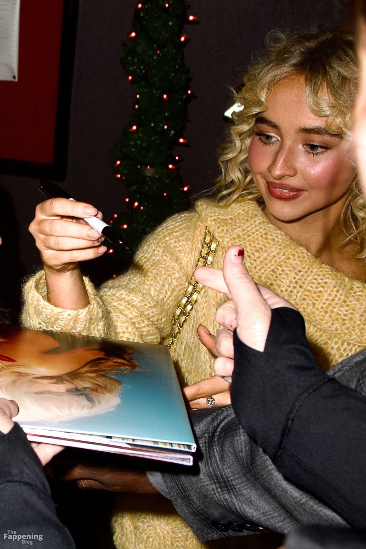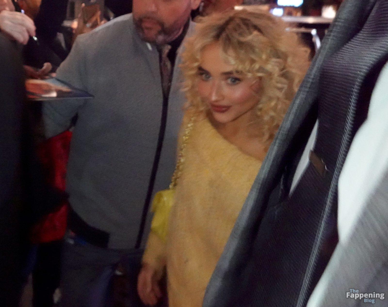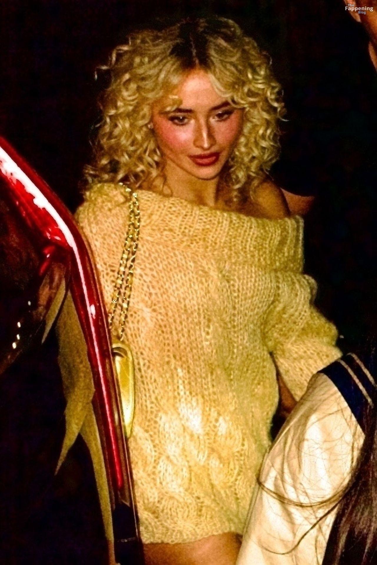 Sabrina Carpenter showed off her legs in a bold no-pants golden sweater, rockin’ curls and a mini bag at an SNL dinner in NYC.