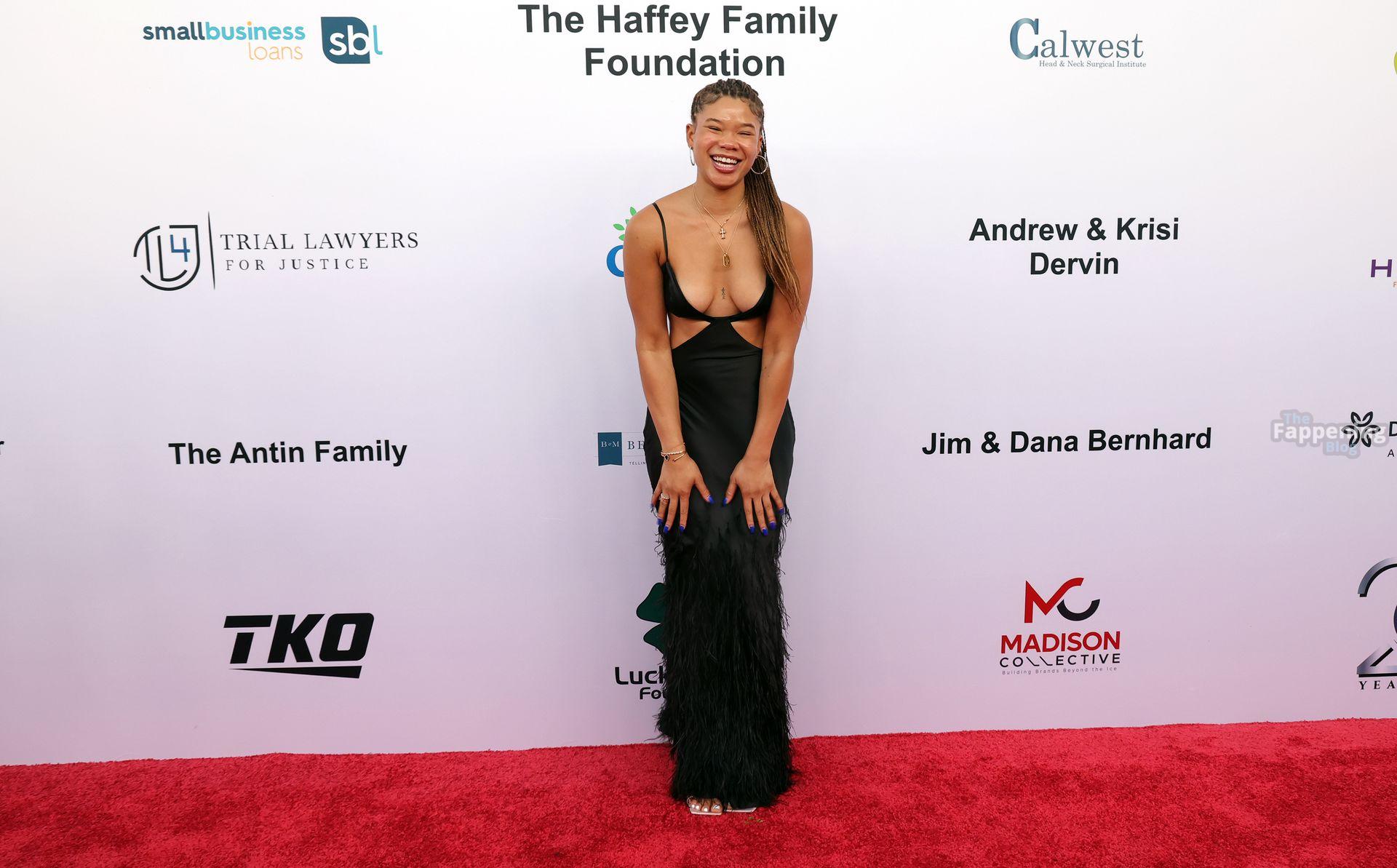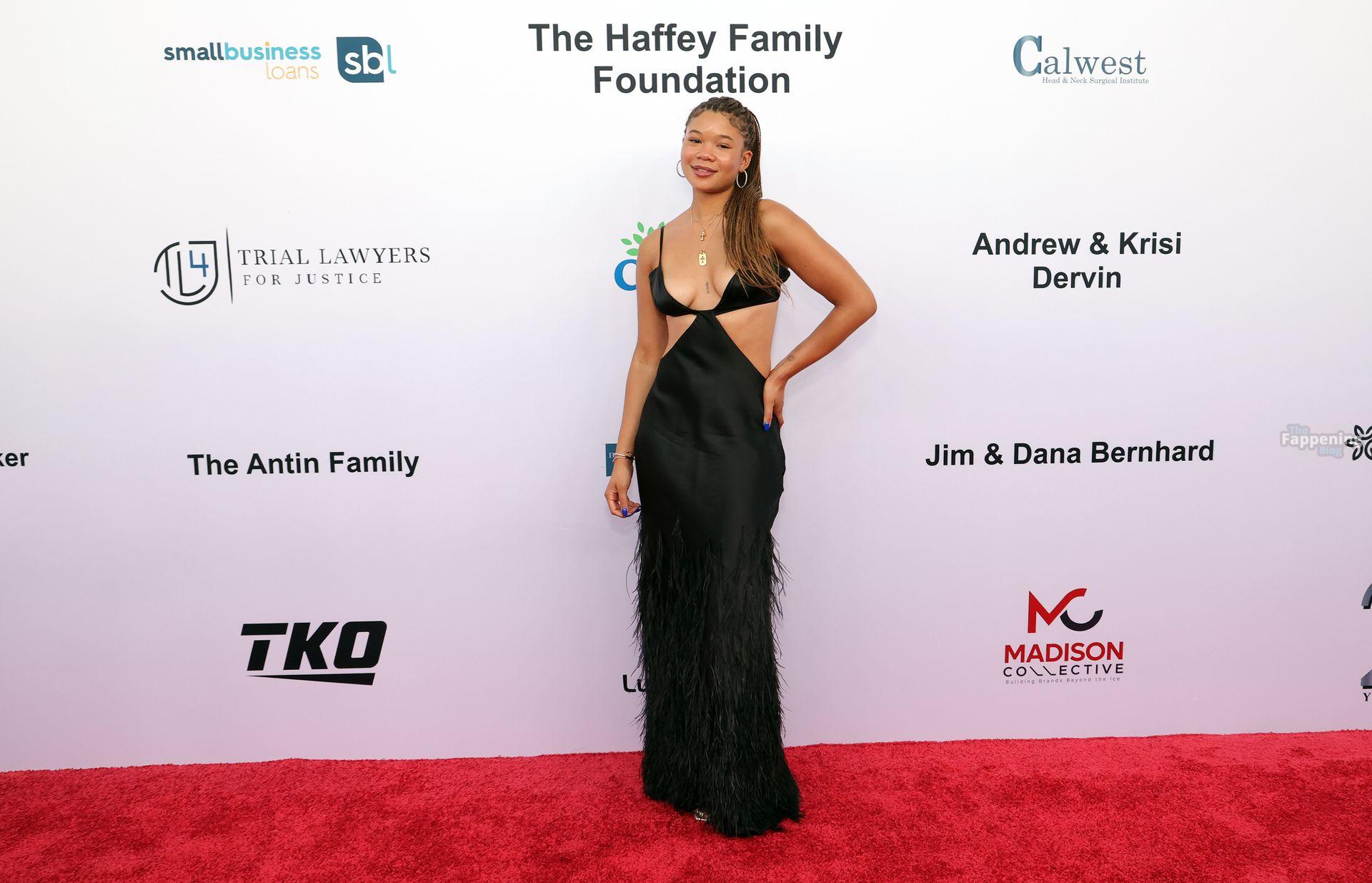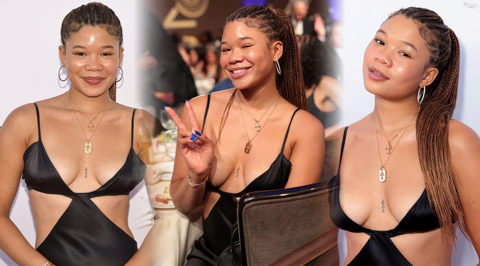 Storm Reid is seen at the Harold and Carole Pump Foundation at The Beverly Hilton in Beverly Hills bash in a wild black gown with some cutouts, showin’ off her sexy tits.