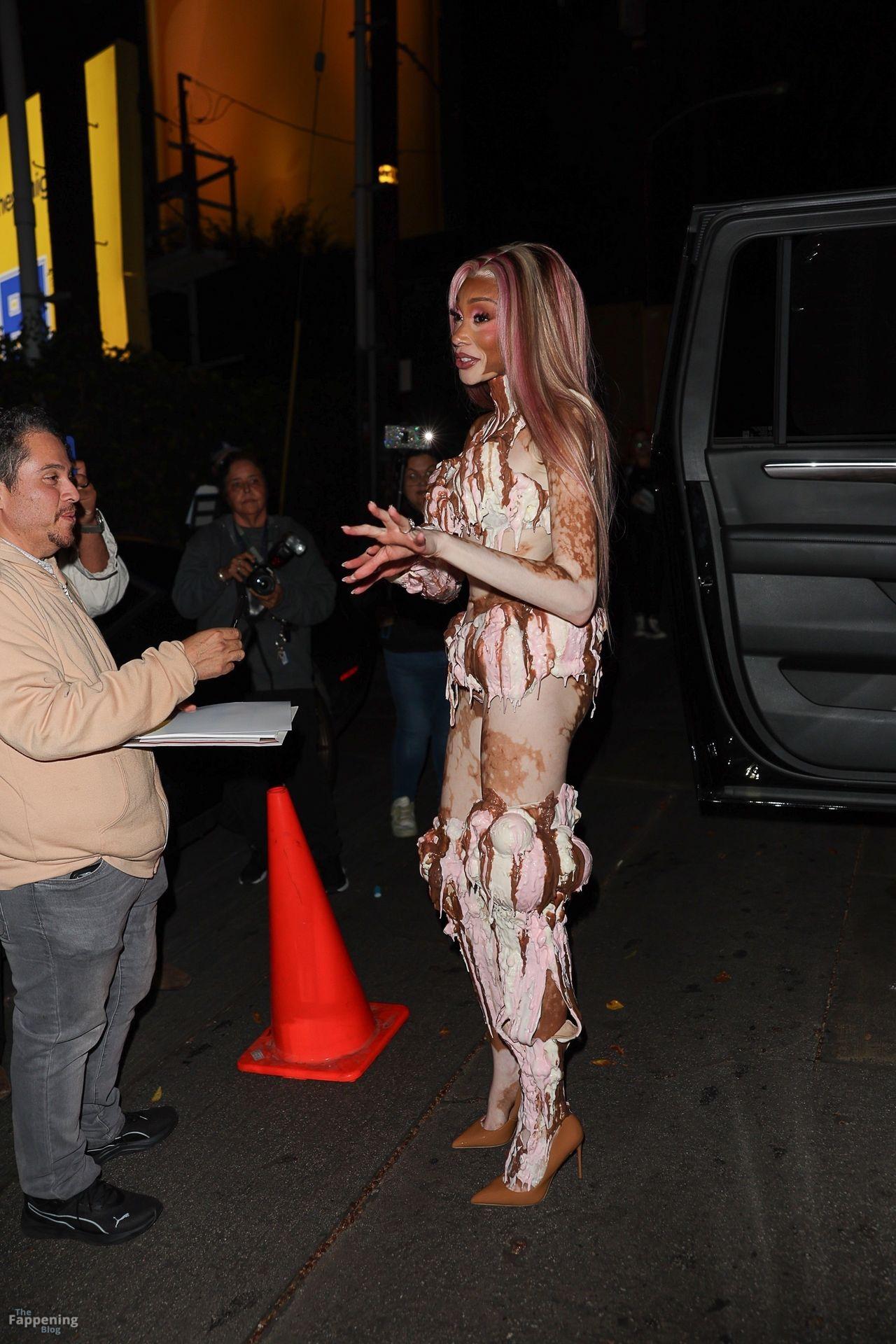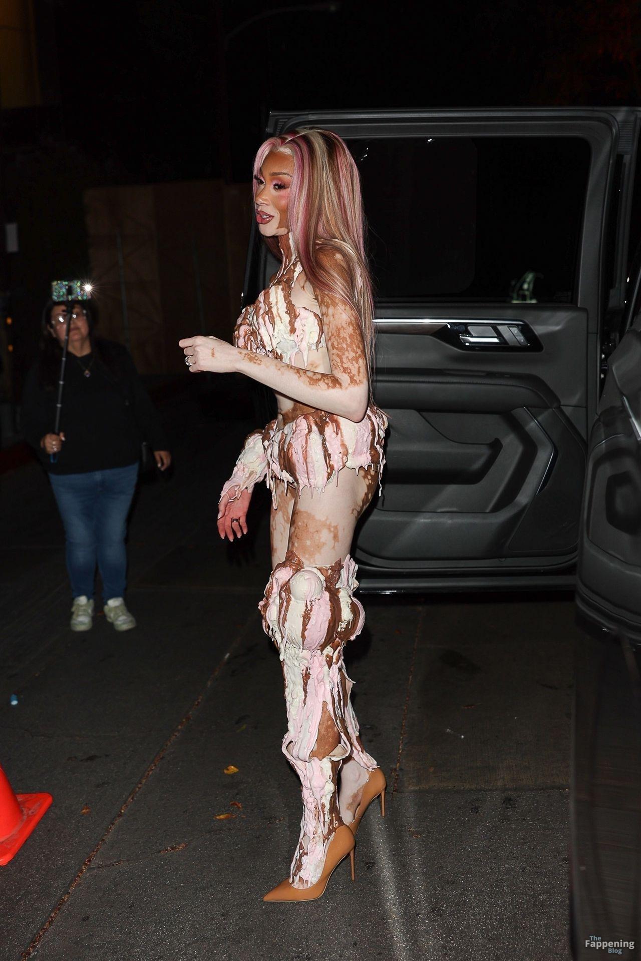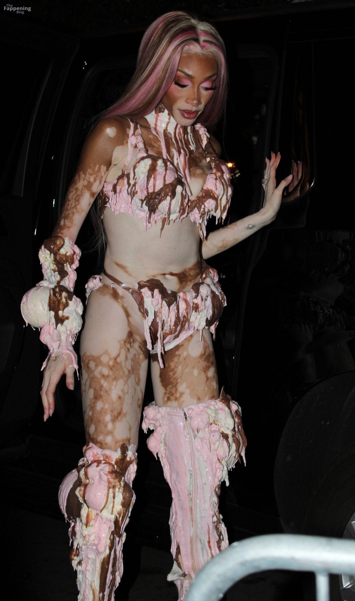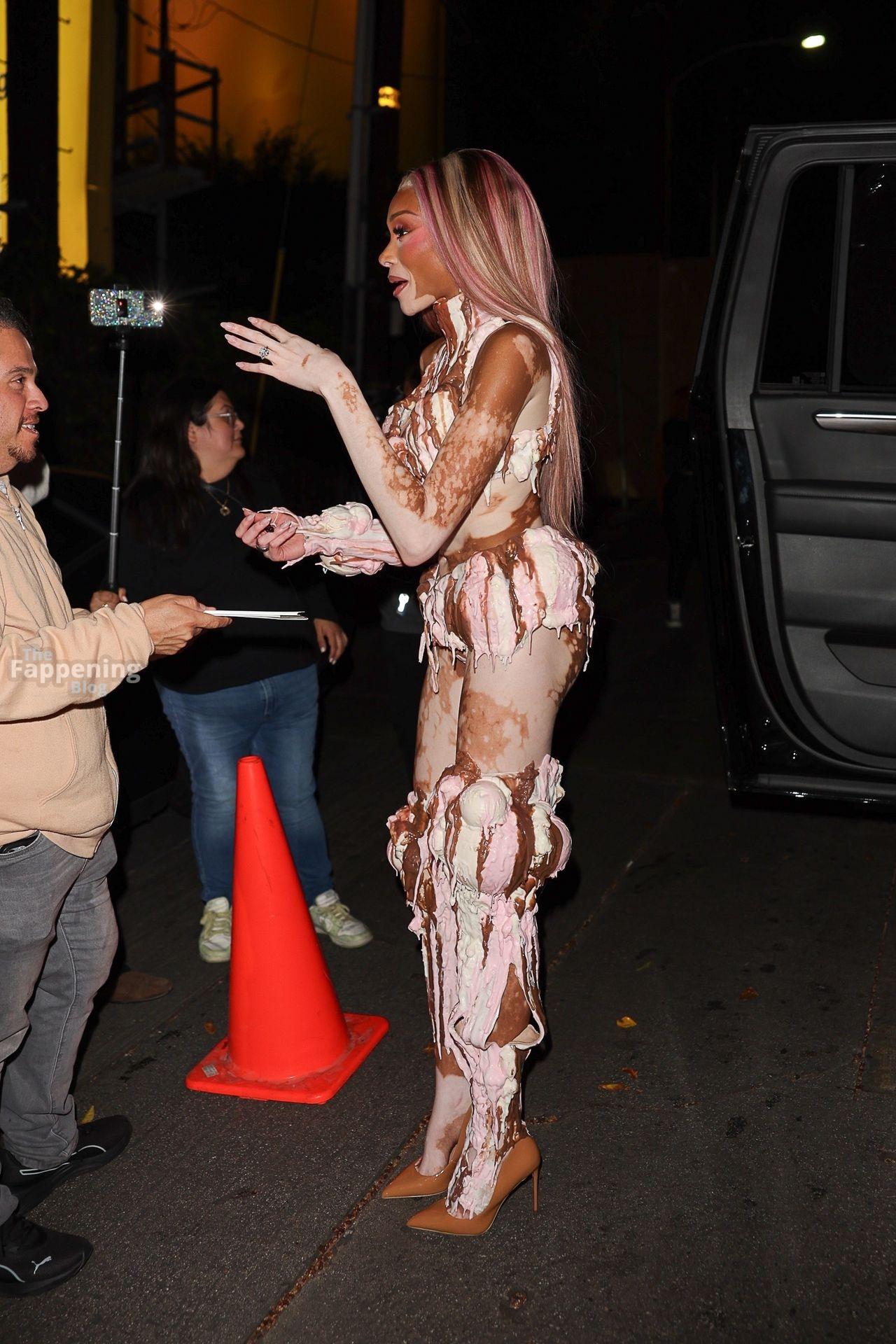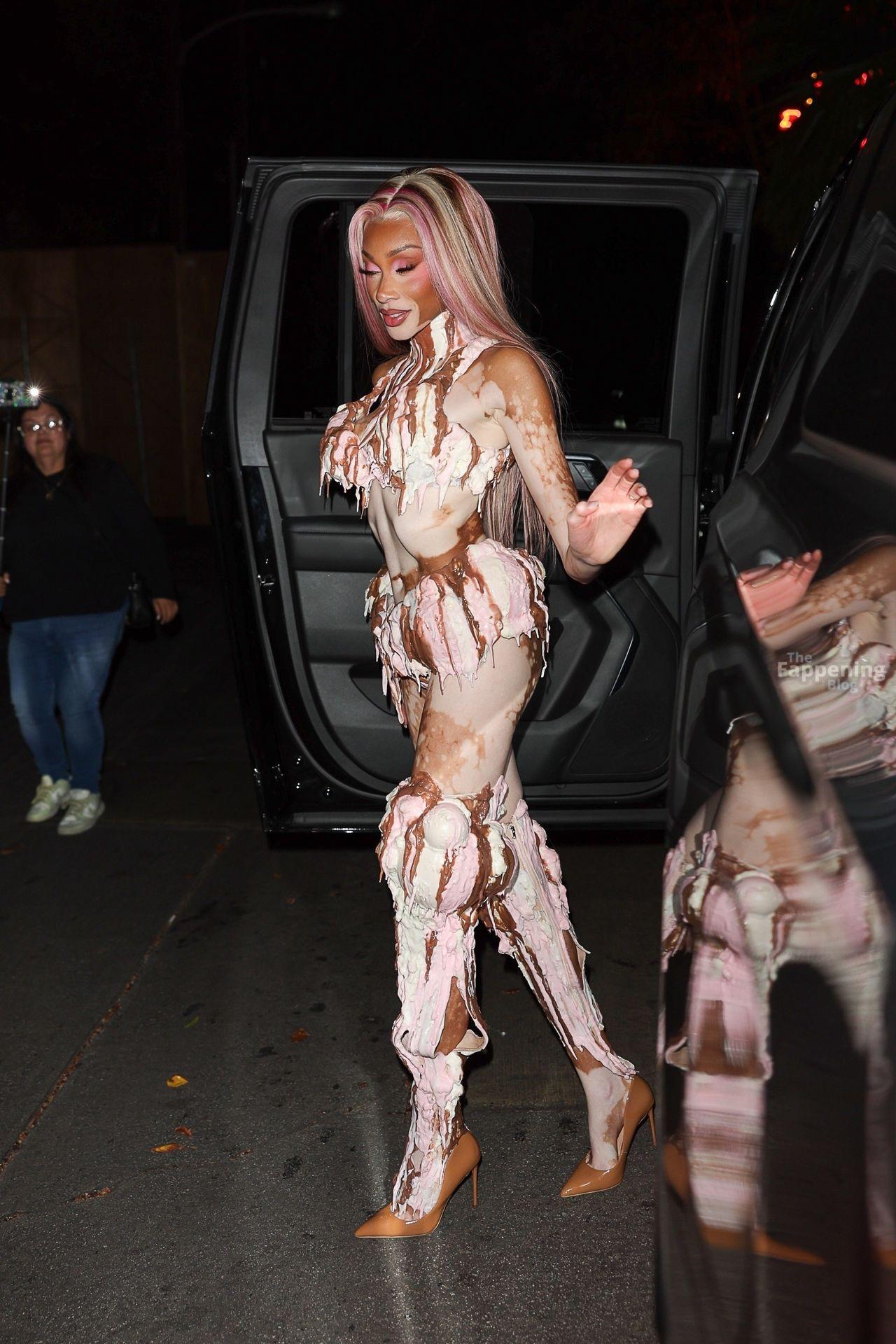 Model Winnie Harlow showed up at Vas J Morgan’s big Halloween bash in LA. Check out her ice-cream outfit in the paparazzi pics below.